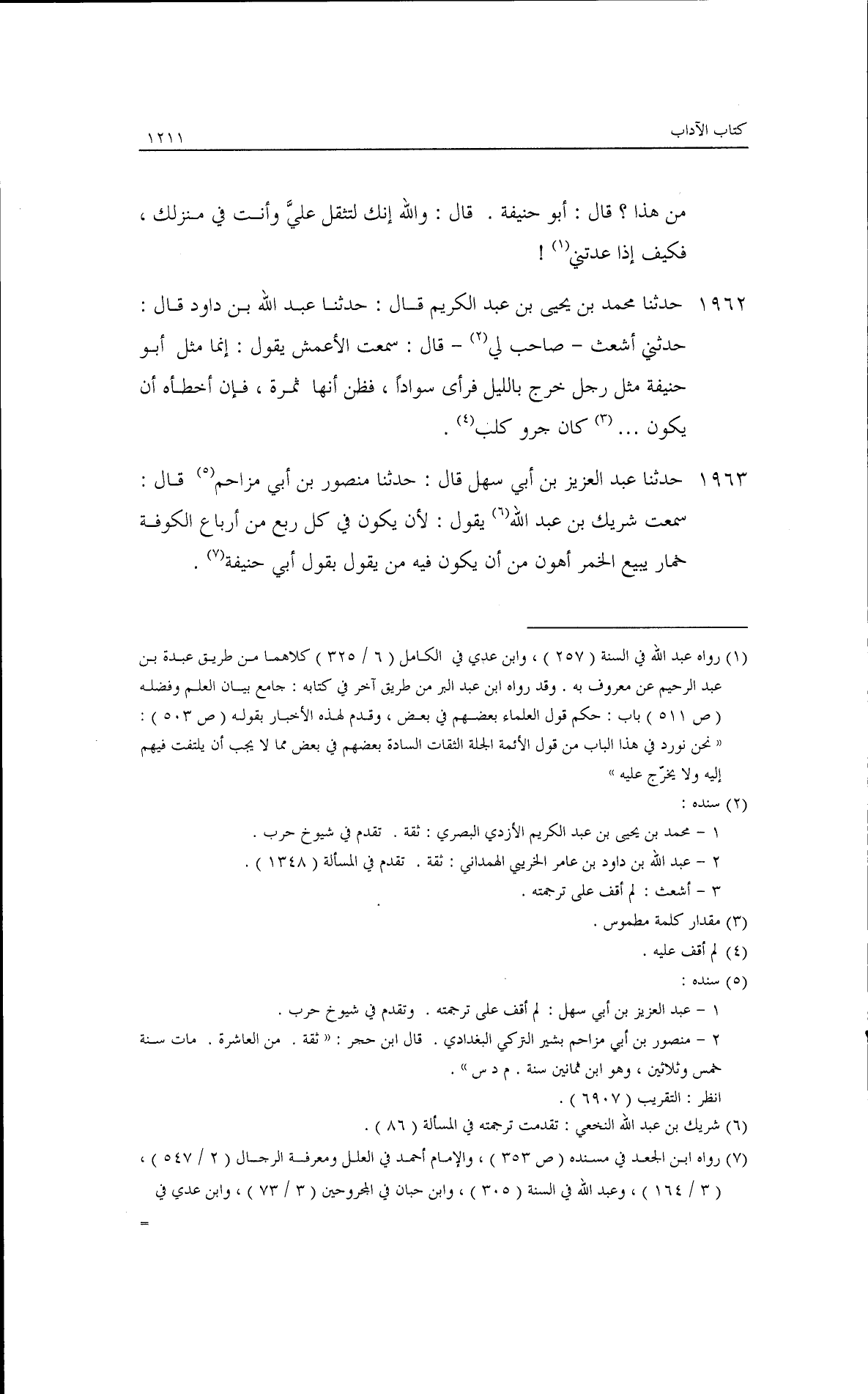 قيل لأحمد: رجل نزلت/227/ [] (¬1) لغير الدين. حدثنا الأزهر قال: سمعت حبيبًا كاتب مالك يقول: قال مالك: كانت فتنة أضر (أبي حنيفة) (¬2) على هذه الأمة من فتنة إبليس في الوجهين جميعًا في الإرجاء، وما وضع من نقص السنن. حدثنا عبدة بن عبد الرحيم بن حسان قال: ثنا معروف بن حسان السمرقندي قال: كنت عند الأعمش وهو مريض، فأتاه (...) يعوده، فقال: (...) لولا أني أثقل عليك لعدتك كل يوم. فقال الأعمش:
