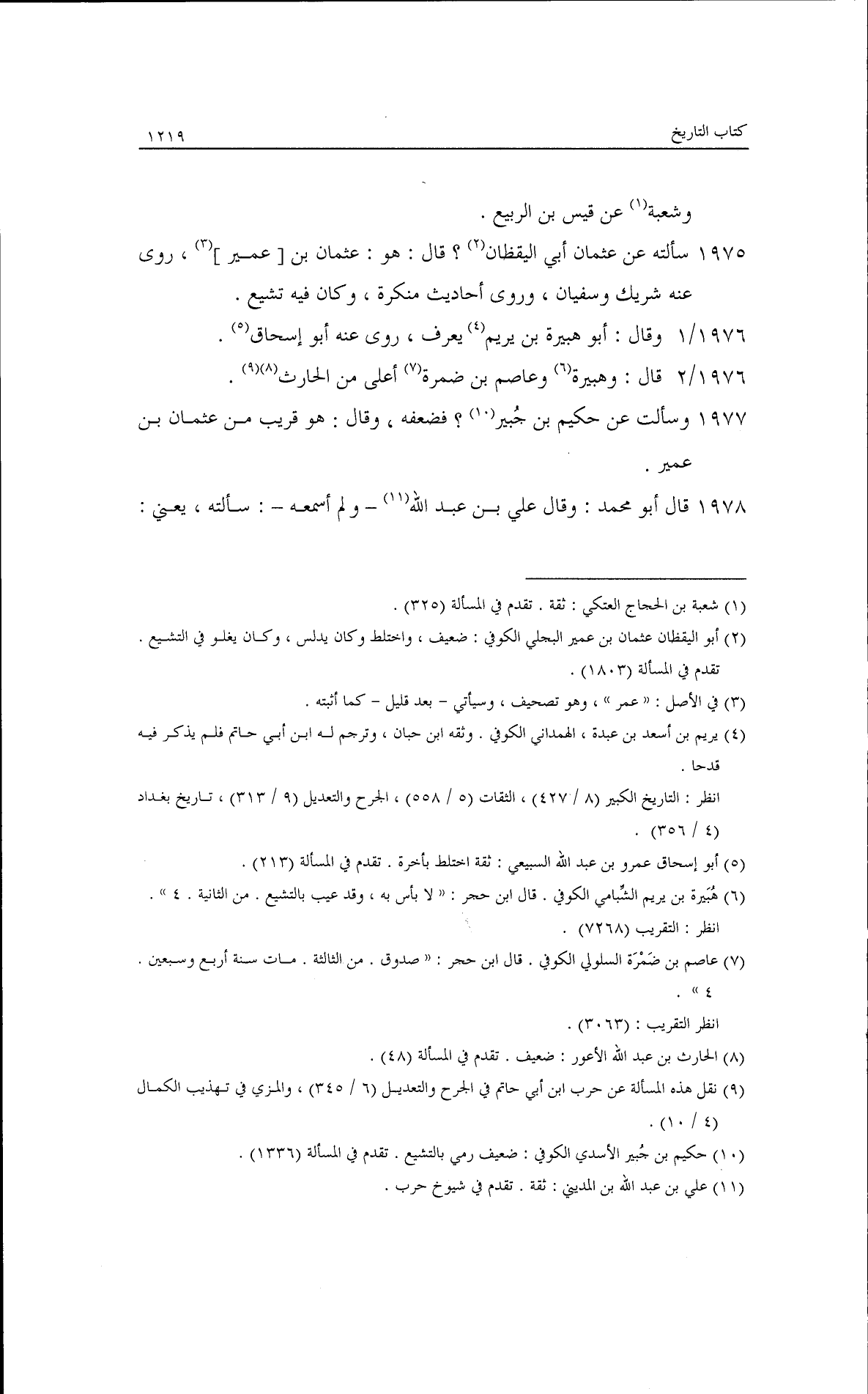 وسمعت أحمد بن حنبل يقول: لم يكن أحد اسمه منصور أفضل من منصور بن زاذان. حدثنا أحمد قال: سمعت يزيد بن هارون قال: زعموا أن منصور بن زاذان كان يختم في الضحى، وإنما كان يعرف ذلك منه بسجود القرآن، وكان سريع القراءة، فإذا أراد أن يترسل فكان لا يستطيع فأرسل بمصحف له إلى فلأن يعني فنقطه. قلت لأحمد: قيس بن الربيع أي شيء ضعفه؟ قال: روى أحاديث منكرة، وقد كان يتشيع ولم يضعف للتشيع. قال أبو محمد: وحدثنا أحمد بن يونس قال: حدثنا قيس بن الربيع، عن أبي حصين، عن حبيب بن صهبان قال: سمعت عمر يقول: ظهر المسلم حمى، لا يحله إلا حد. قال: ولقد رأيت بياض إبطه هو مقيد رجلًا من نفسه. قال أحمد بن يونس: هذا الحديث رواه أبو بكر بن عياش