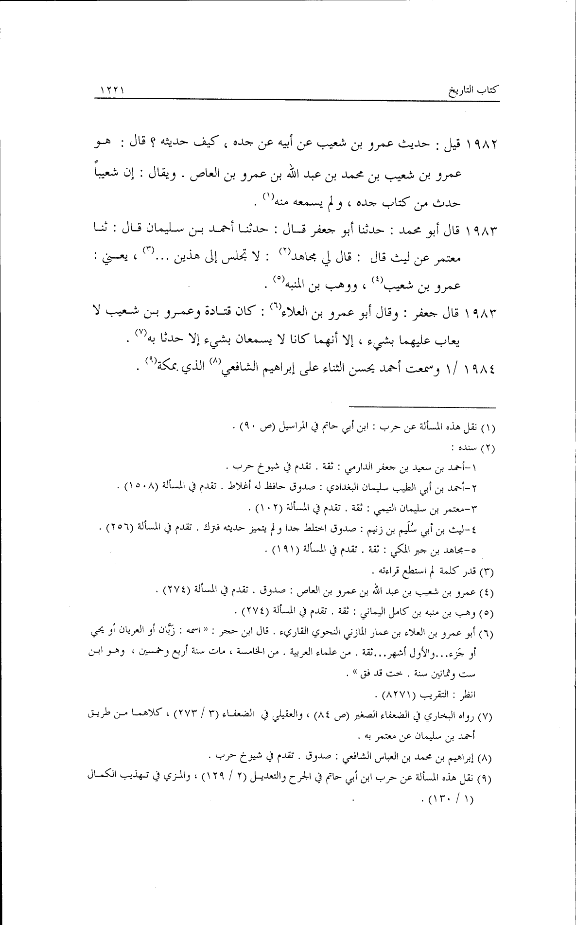 يحيى بن سعيد عن حكيم بن جبير فقال: كم روى؟ إنما روى شيئًا يسيرًا. قال يحيى: وقد روى عنه زائدة. قلت ليحيى: من تركه)) قال: شعبة من أجل هذا الحديث. قلت: حديث الصدقة؟ قال: نعم، ثم قال يحيى: نحن يحدث عمن هو دون هؤلاء. قال أحمد: إبراهيم بن أبي يحيى المدني ضعيف/231/ لا يكتب حديثه. قلت: لأحمد؛ فإن بشر بن المفضل قال: إبراهيم بن أبي يحيى كذاب؟ قال: قد قال ذاك بشر وغيره. قال أبو محمد: سمعت عبيد الله بن معاذ يحدث عن بشر بن المفضل قال: سألتُ فقهاء المدينة عن إبراهيم بن أبي يحيى فكلهم يقول: كذاب، أو نحو هذا. وسمعت أحمد يقول: كان يزيد بن خمير كيسًا، ويمدحه، ويقول: حديثه حسن.