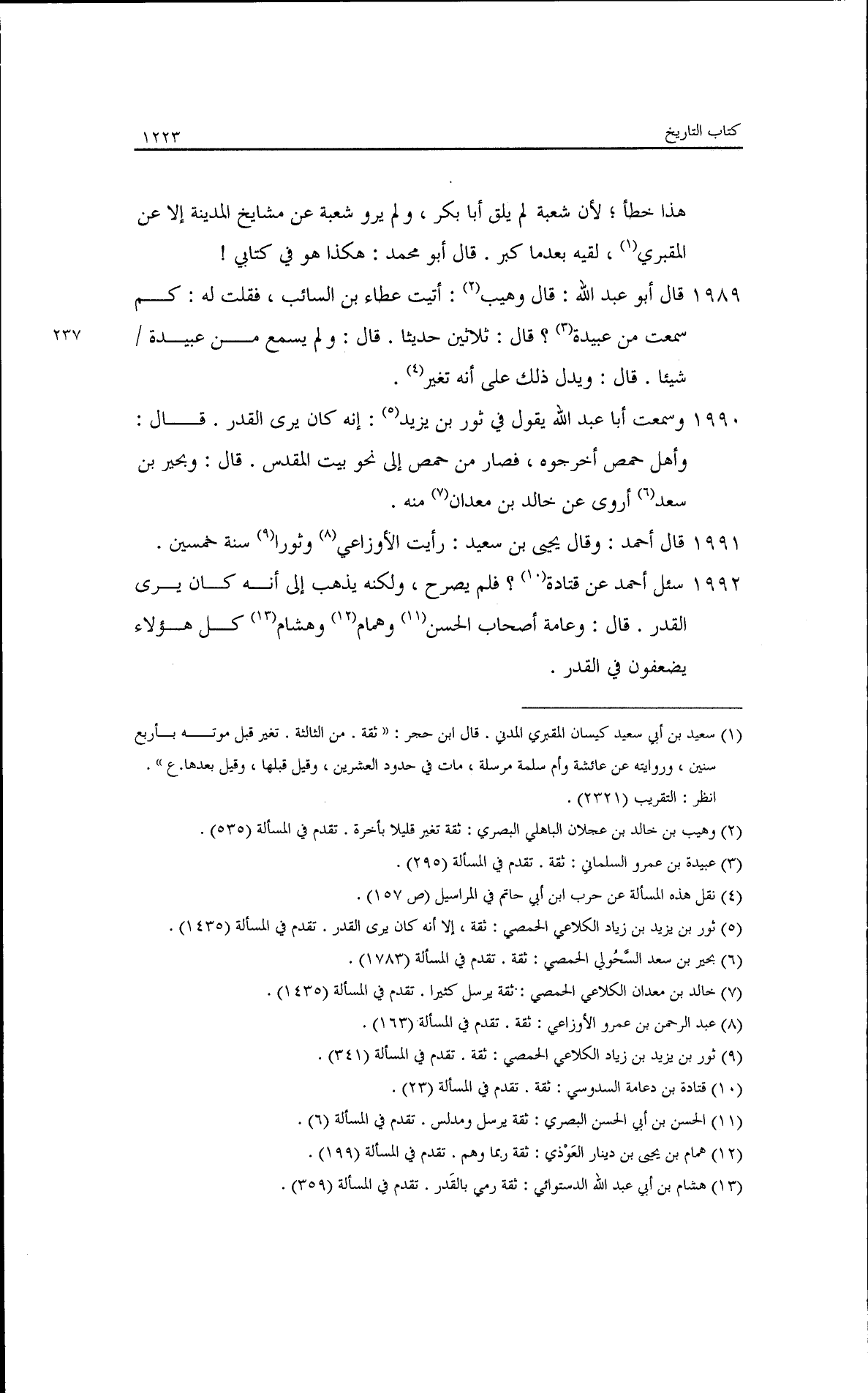 وسعيد بن منصور وقال: إن محمد بن معاوية ذو أحاديث منكرة. قلت لأبي عبد الله: عطاء بن السائب تغير في آخر أمره؟ قال: نعم تغيرًا شديدًا. قال: ومن روى عنه بآخره فهو ضعيف مثل: إسماعيل بن علية، وعلي بن عاصم، وخالد الطحان، وجرير، وعامة البصريين. قال أبو محمد: وقال علي بن عبد الله قال يحيى: ما سمعت أحدًا من الناس يقول في عطاء بن السائب شيئًا قط في حديثه القديم. قلت ليحيى: ما حدث شعبة وسفيان عن عطاء بن السائب أصحيح هو؟ قال: نعم، إلا حديثين كان شعبة يقول سمعتهما بآخره عن زاذان. قال أحمد: كان عبد الكريم أبو أمية مرجئًا. قال أحمد: روح، عن شعبة، عن ابن أبي بكر، عن أبيه أنه كان ينفر يوم الثاني. وقال عبد الرحمن، عن شعبة قال: سمعت أبا بكر، قال أبو عبد الله: