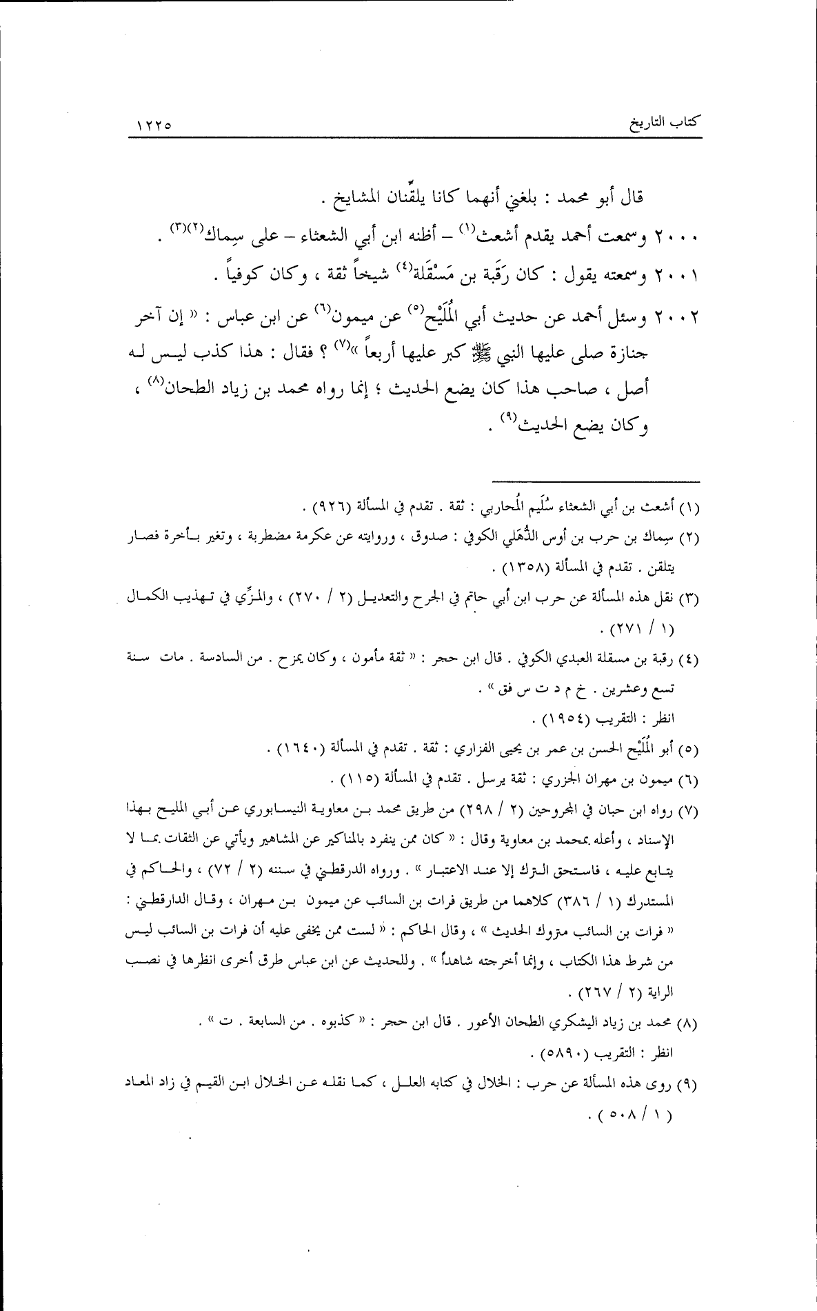 قيل لأبي عبد الله: إن بعض الناس قال: إنك لا تروي عن أبي أسامة؟ فقال: بلى، نحن نروي عن أبي أسامة. وقال: ما صح من حديث علي بن عاصم فلا بأس به. وقال: أبو معاوية أثبت في حديث الأعمش منه في غيره، وقال: هو أثبت في الأعمش من جرير، وقال: كان يحيى بن سعيد يقدم منصور والحكم على الأعمش، وقال: ما أثبت أبا نعيم وأكسبه، ولأنقدمه على ابن مهدي. وقال: كان ابن مهدي صاحب دين وخير. وقال: عند أبي نعيم نصف ما عند ابن مهدي فكيف يستويان؟ قلت لأحمد: اكتب من كتب أبي عبيد شيئًا؟ فسكت كأنه يضعف. وسألتُه عن الواقدي وأبي البحتري، فزبرني، وقال: نحن بعد في أبي البختري. وقال: آه آه.