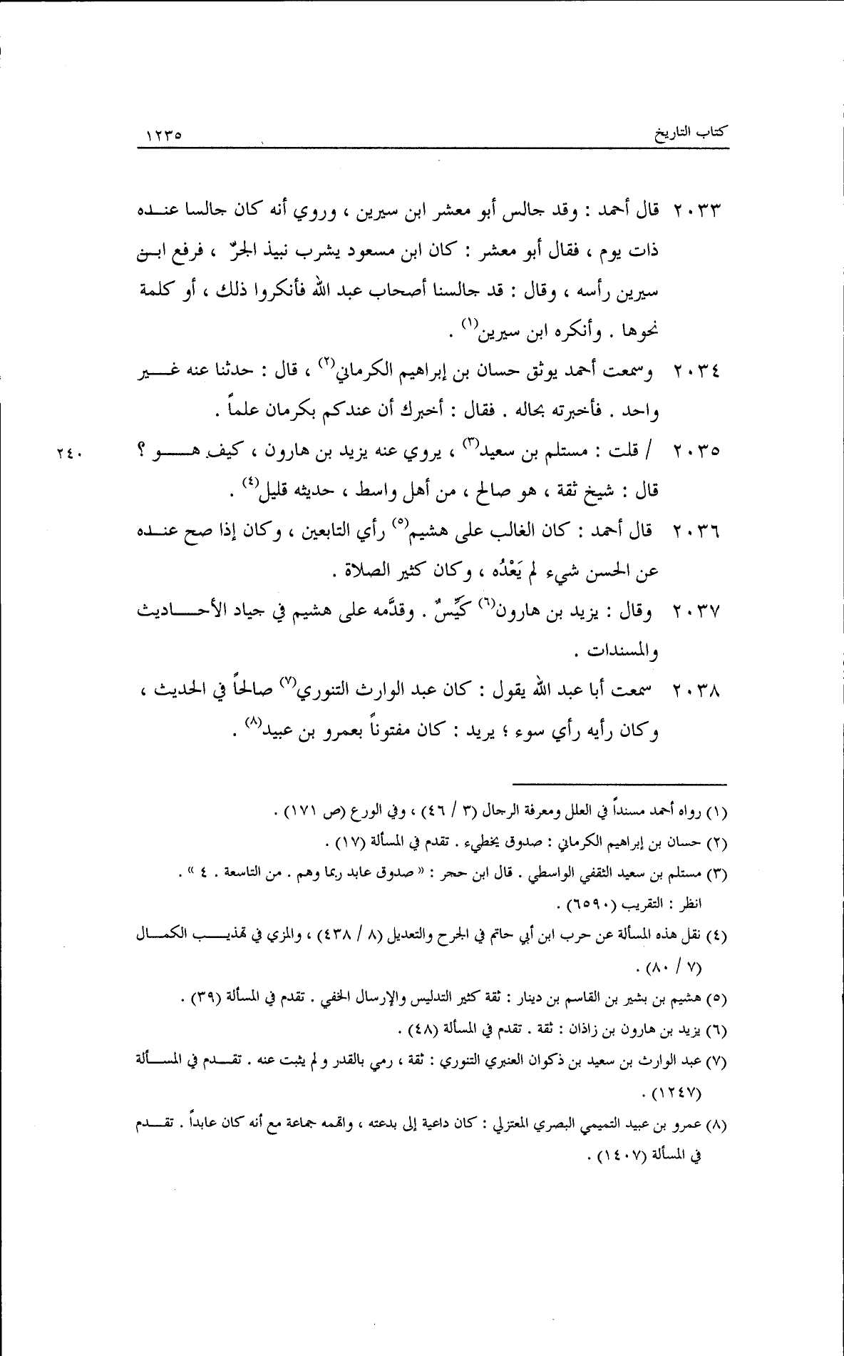 وسئل أحمد: عثمان البتي ابن من؟ فقال: لا أدري، وكان هشيم لا يقول البتي يقول: عثمان أبو عمر. وسئل أحمد عن حديث خالد، عن رجل، عن أبي معشر، عن إبراهيم، عن عبد الله في بيع ده دوازده ما لم يأخذ للنفقة ربحًا. فقال: حدثناه محمد بن بشر، عن سعيد بن أبي عروبة قال: حدثنا خالد، عن أبي معشر، عن إبراهيم، عن عبد الله قال: وليس كلهم يذكر فيه خالد، ثم قال أحمد: وقد رفع خالد عن إبراهيم إلى عبد الله أحاديث يرسلها غيره، منها هذا، وحديث: ((إذا توالى عليه رمضانان))، وفي الجنب يقرأ بعض الآية.