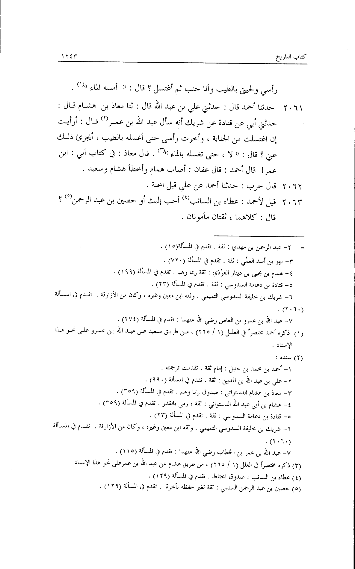 بن خليفة قال: سألتُ عبد الله بن عمرو: آكل وأنا جنب؟ قال: توضئ وضؤك للصلاة ثم كل إن شئت. حدثنا أحمد، قال: ثنا يحيى بن سعيد، قال: حدثنا ابن زبي عروبة، عن قتادة، عن أبي أيوب، عن عبد الله بن عمرو قال: الجنب إذا أراد أن يطعم توضأ. حدثنا أحمد، قال: حدثنا عبد الرحمن بن مهدي وبهز قالا: حدثنا همام، عن قتادة، عن شريك بن خليفة قال: سألتُ عبد الله بن عمرو: أغسل