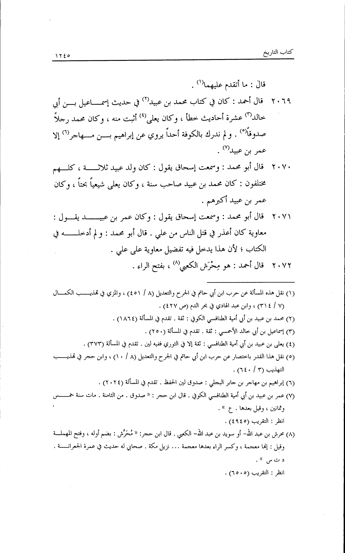 قلت: يحيى بن الحرار سمع من علي؟ قال: لا. حدثنا أحمد قال: ثنا يحيى قال: حدثنا شعبة، عن الحكم قال: كان يحيى بن الحرار يغلو. يعني في التشيع. وسئل عن أبي الزبير فقال: قد احتلمه الناس. قال: وأبو الزبير أحب إليّ من أبي سفيان. وسمعته يقول: كان القعنبي من خيار أهل الإسلام.
