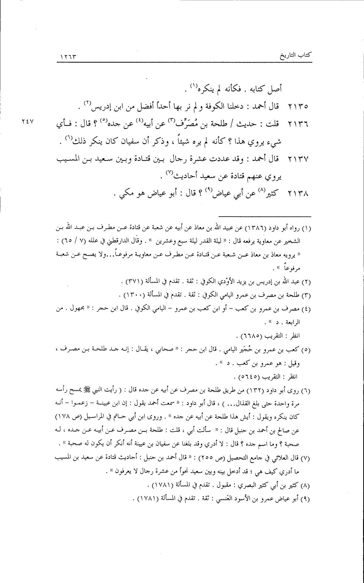 قال أحمد: يحيى بن سعيد الذي روى عنه يزيد بن هارون وحماد وغيرهما هو شيخ ثقة مأمون من أهل العلم، وهو يحيى بن سعيد بن قيس بن قهد، وأخوه عبد ربه بن سعيد. قلت: حديث ابن أبي حثمة ورافع بن خديج في القسامة أليس الحديث حديث يحيى بن سعيد عن بير بن يسار، رواه حماد بن زيد؟ قال: نعم. قال أحمد: الشيباني لم يرو عن النخعي؛ لأنه غاب فقدم، وقد مات إبراهيم. قلت: يروى عن معاوية عن النبي - عليه السلام - في ليلة القدر شيء؟ قال: أما في كتاب غندر وغيره من أصحاب شعبة فليس هو مرفوعًا، وبلغنا أن معاذ بن معاذ رفعه.