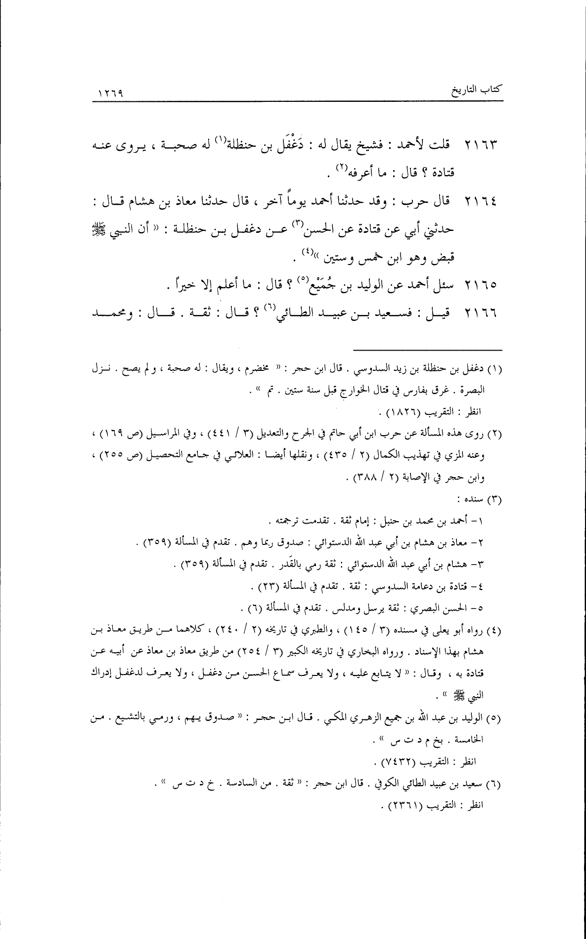 سمعت أبا عبد الله أحمد بن حنبل يقول: إياس بن دَغْفَل شيخ بصري ثقة. قال أحمد: وما أعلم قتادة روى عن أحد من أصحاب النبي - صلى الله عليه وسلم - إلا عن أنس. قيل: فأين سرجس؟ فكأنه لم يره سماعًا.