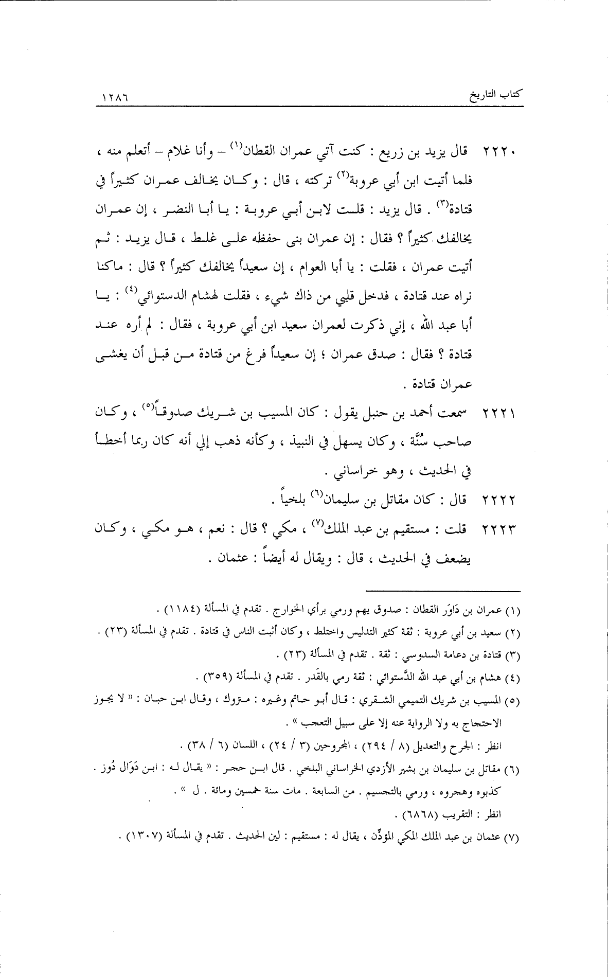 قال: وسأل سفيان الرأس يزيد بن زريع وأنا شاهد فقال: ما تقول في أبي هلا ل الراسبي؟ قال: لا شيء. قال: ما تقول في البُرى؟ قال: لا شيء. قال: فما تقول في الربيع بن صبيح؟ قال: سمعت منه أشياء لا أدري أين هي مطروحة. قال: ما تقول في حماد بن سلمة وحماد بن زيد أيهما أثبت؟ قال: حماد بن زيد أثبت.