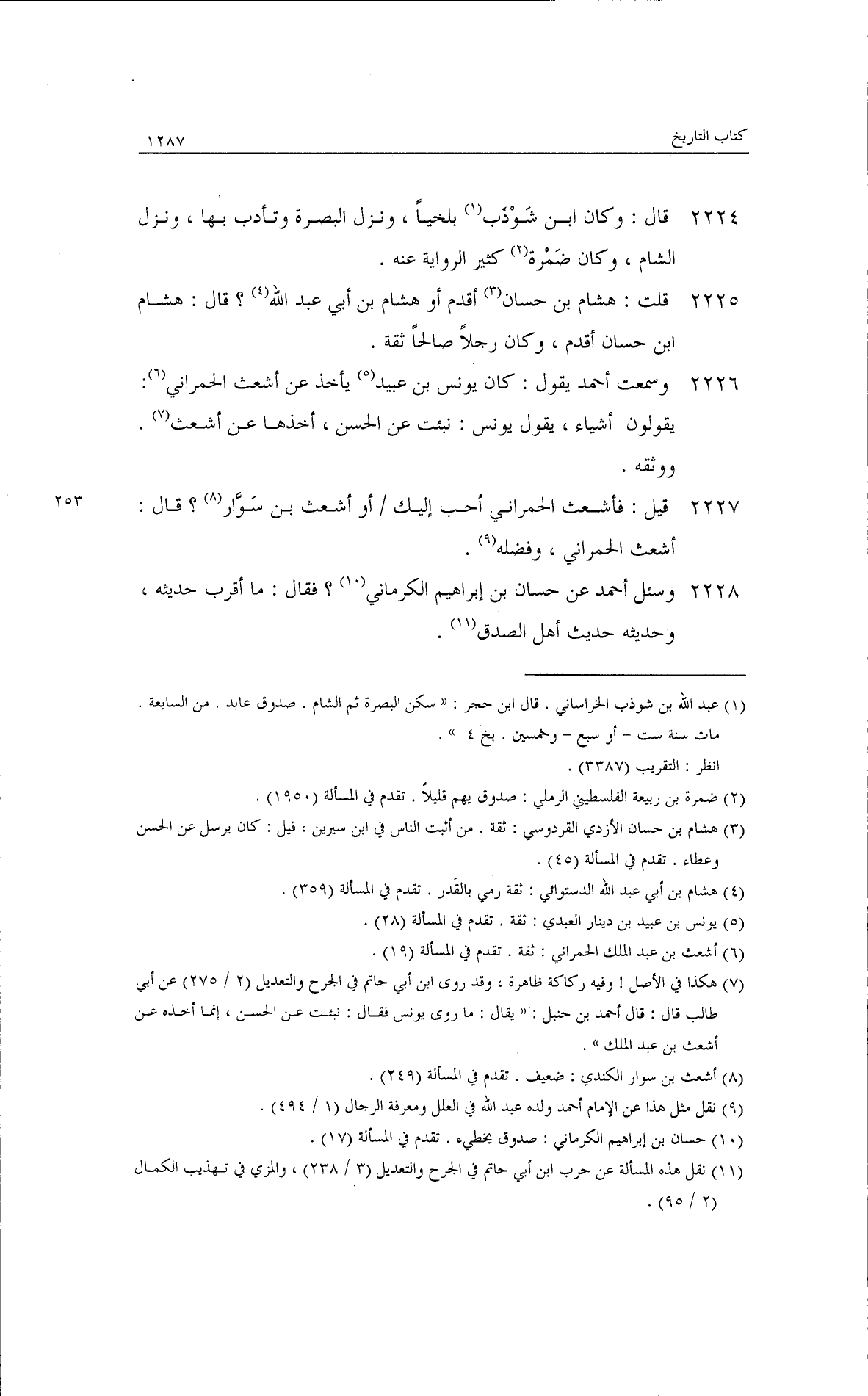 قال يزيد بن زريع: كنت آتي عمران القطان وأنا غلا م أتعلم منه، فلما أتيت ابن أبي عروبة تركته، قال: وكان يخالف عمران كثيرًا في قتادة، قال يزيد: قلت لابن أبي عروبة: يا أبا النصر إن عمران يخالفك كثيرًا؟ فقال: إن عمران بني حفظه على غلط، قال يزيد: ثم أتيت عمران فقلت: يا أبا العوام إن سعيدًا يخالفك كثيرًا؟ فقال عمران: ما كنا نراه عند قتادة. فدخل قلبي من ذاك شيء. فقلت لهشام الدستوائي: يا أبا عبد الله إني ذكرت لعمران سعيد بن أبي عروبة فقال: لم أره عند قتادة. فقال: صدق عمران إن سعيد أفرغ من قتادة من قبل أن يغشى عمران قتادة. سمعت أحمد بن حنبل يقول: كان المسيب بن شريك صدوقًا، وكان صاحب سنّة، وكان يسهل في النبيذ، وكأنه ذهب إلى أنه كان ربما أخطأ في الحديث، وهو خراساني. قال: كان مقاتل بن سليمان بلخي. قلت: مستقيم بن عبد الملك مكي؟ قال: نعم هو مكي، وكان يضعف في الحديث قال: ويقال له أيضًا عثمان.