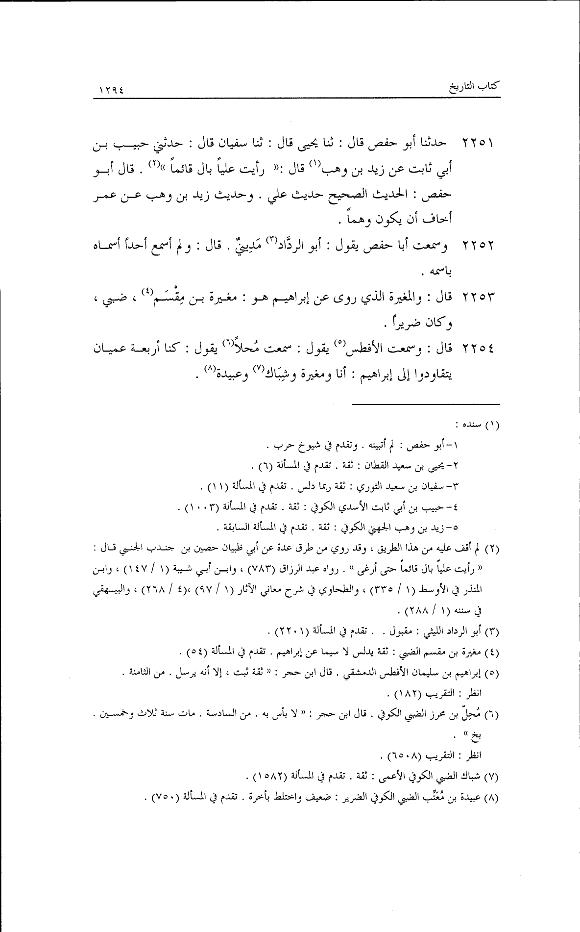 أريد حديث القدر. قال: أنا والله الذي لا إله إلا هو حدثته به. أنا والله الذي لا إله إلا هو حدثته به. أنا والله الذي لا إله إلا هو حدثته به، غفر الله للأعمش كما حدث به، وغفر الله لمن حدث به قبل الأعمش، وغفر الله لمن حدث به بعد. قال أبو عبد الله: وسألني عنه غير واحد فذكر ابن داود وأبا عاصم النبيل وأبا الوليد وغير واحد، وأنا رأيت أبا إسحاق الرمادي. وحدثنا أبو حفص قال: ثنا أبو معاوية قال: ثنا الأعمش، عن زيد بن وهب قال: رأيت عمر بال قائمًا.