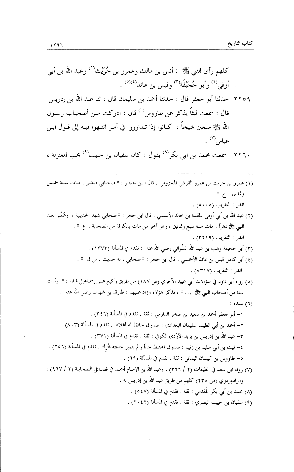 قال: ومنصور بن زاذان أصله واسطي، ومنصور بن المعتمر كوفي من بني سليم. قال أبو حفص كان للحسن ابن أبي الحسن أخوان: سعيد بن أبي الحسن، وعمّار بن أبي الحسن. حدثنا أبو معن، قال: حدثنا مؤمل، قال: حدثنا حماد بن سلمة، عن سماك بن حرب قال: لقيت ثمانين من أصحاب النبي - صلى الله عليه وسلم -. حدثنا أبو جعفر الدارمي، قال: حدثنا أحمد بن سليمان قال: ثنا سعيد بن محمد الوراق، عن إسماعيل بن أبي خالد قال: رأيت خمسة رجال