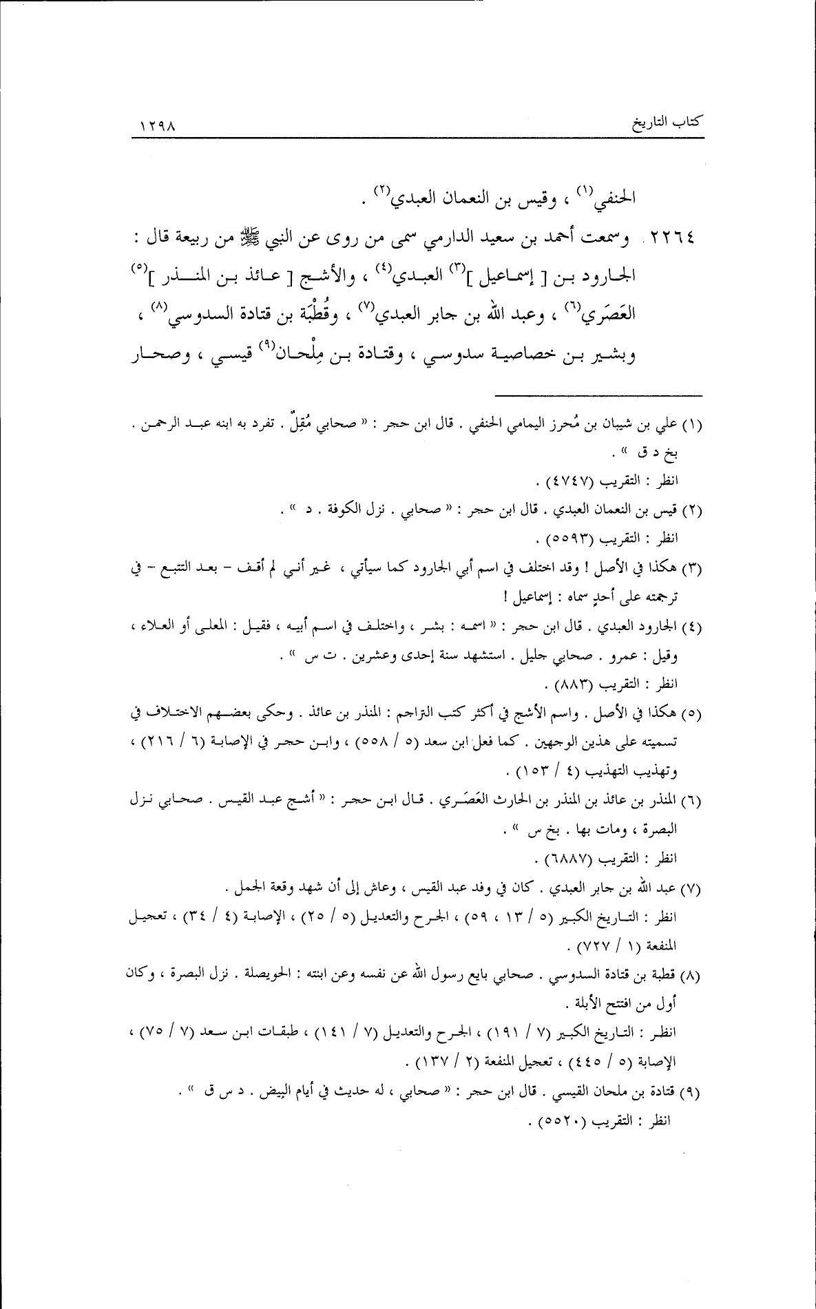 قال: وكان عبد الوارث أشد وأشد. قلت: فعبد الصمد؟ قال: كان ينافق كان يظهر لا هل السنة أنه منهم، ولهؤلاء أنه منهم. وسمعت أبا معن قال: كان سفيان بن حبيب قدريًا. قال أبو محمد: وقال علي بن عبد الله - ولم أسمعه - قال يحيى كان سفيان بن حبيب عالمًا والله بحديث سعيد بن أبي عروبة. قال أبو حفص: روى عن النبي - صلى الله عليه وسلم - من ربيعة: صحار بن عباس العبدي، وأحمر بن جزء السدوسي، وبشير بن الحضاضية، وطلق بن علي الحنفي، وفرات بن حيان العجلي، وعلي بن شيبان
