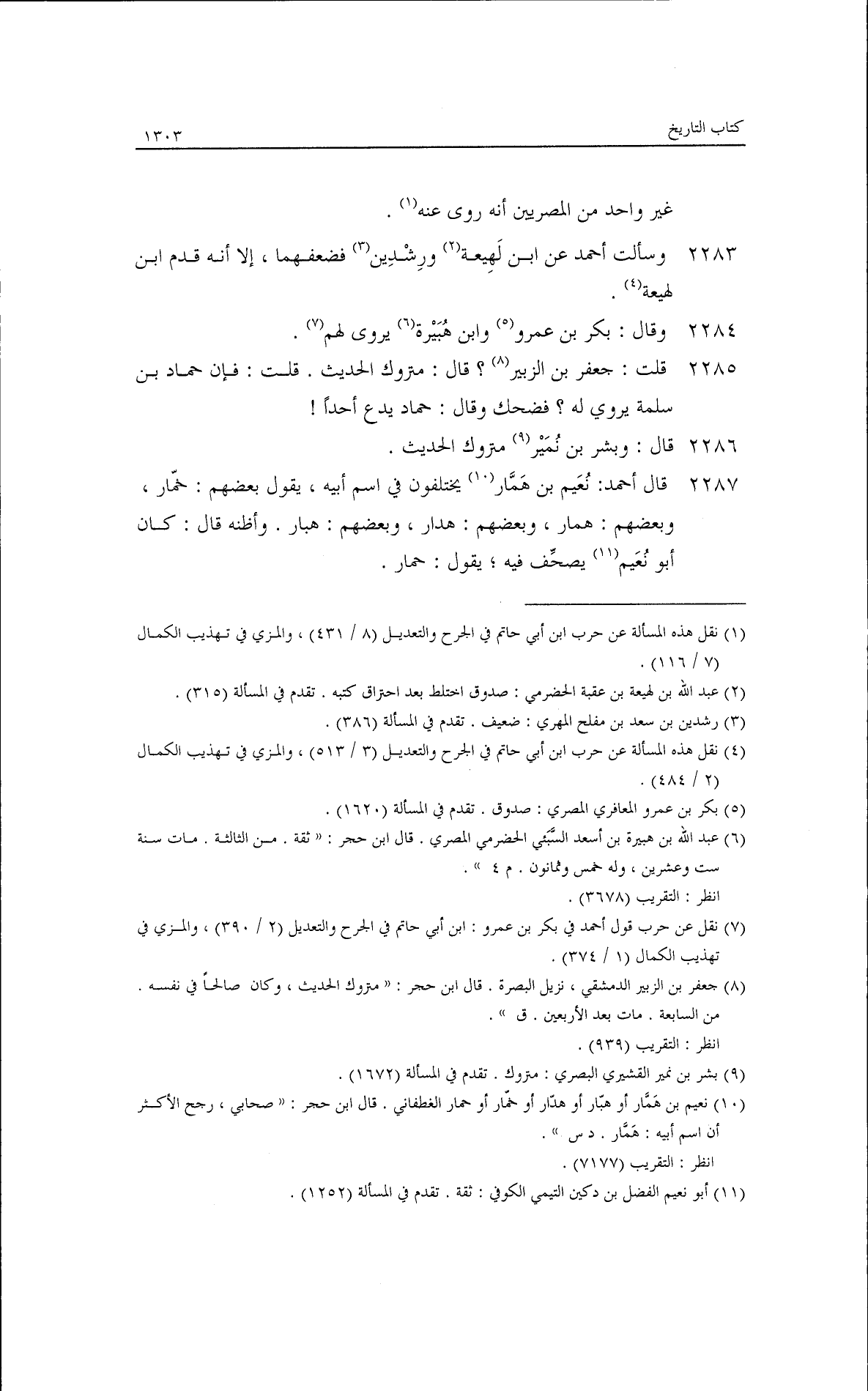 قال: بكر بن مضر ثقة، وهو مصري، وكان يشبه بفضيل بن عياض في صلا حه. قلت: يحيى بن أيوب المصري؟ قال: صالح وحيوة فوقه. قلت: عبيد الله بن زَحْر؟ فضعفه. قلت: فعلي بن يزيد؟ فقال: هو دمشقي، وكأنه ضعفه. قال: والقاسم هو مولى معاوية. وهذه الأحاديث التي رويت عن هؤلاء عن القاسم منكرة. قال: وأظن ذلك من القاسم جاء الغلط. قلت: فيحيى بن أيوب الكوفي؟ قال: صالح. قلت: مشرح بن هاعان معروف؟ قال: نعم هو معروف، فذكر