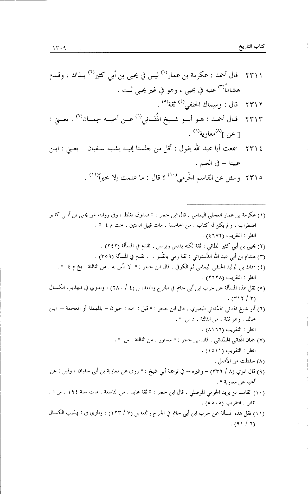قلت: عباد بن كثير هو بصري سكن مكة، وهو ضعيف في الحديث، روى عجائب منكرات وذهب إلى أنه متروك، وقد روى عنه زهير. قال: وللشاميين شيخ يقال له: عباد بن كثير. وسئل عن حديج بن معاوية؟ فقال: ليس أنا بذاك الخبير به، جاءه ابن مبارك فكتب عنه. قال أحمد: وابن جريج هو عبد الملك بن عبد العزيز بن جريج قال: /253/وأبوه يروي عن عائشة، وذهب أحمد إلى أنه لم يلق عائشة. قال: وكان سالم يعني الأفطس يرى الإرجاء. قال: إبراهيم بن ميسرة يثبت الحديث وكان أحد الثقات.