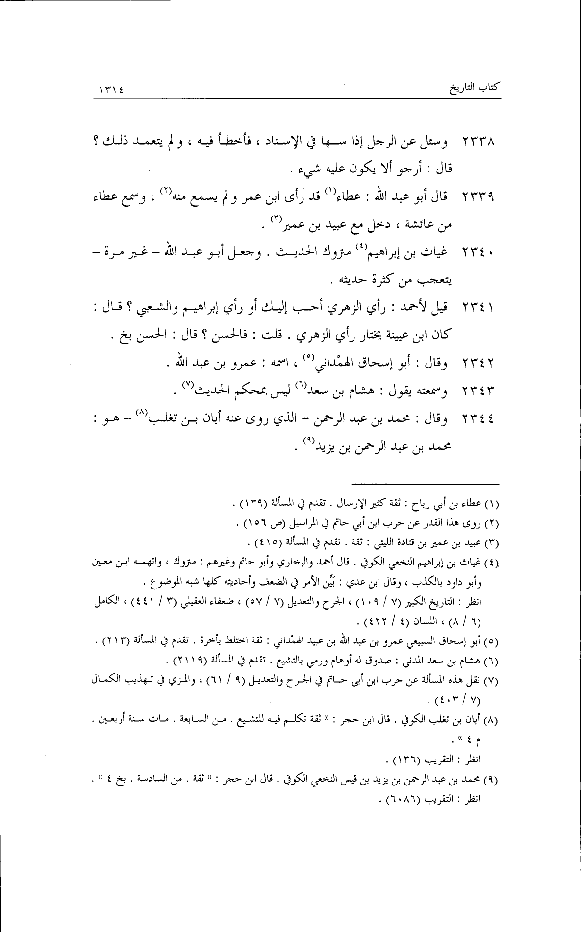 قال أحمد: ابن جريج روى عن ستة عجائز هن من عجائز المسجد الحرام. قال: وكان صاحب علم. قيل: خصيف أحب إليك أو سالم الأفطس؟ قال: سالم، وقدمه على خصيف قال: وخصيف وسالم وعبد الكريم هؤلاء الثلاثة من أهل حران من الجزيرة. قلت: عون بن كهمس تعرفه؟ قال: لا أعرفه. قال: وكهمس شيخ ثقة. وسئل عن عبيس بن ميمون؟ قال: لا أدري كيف هو زعموا أنه روى منكرات. وسئل عن عس بن كهمس؟ قال: لا أدري.