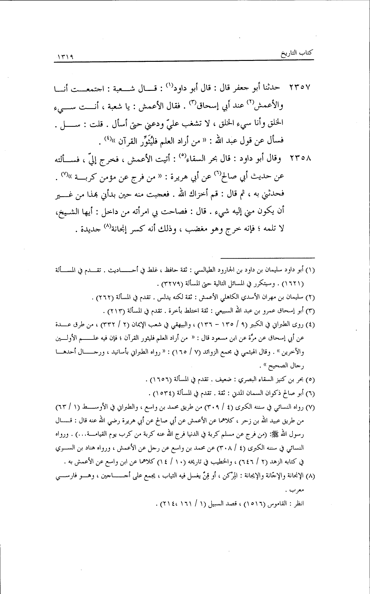 قال لي شعبة: ما جمع لك عطاء بن السائب من رجاله عن زاذان وميسرة وأبي البختري فلا تكتبه، وما حدثك به عن رجل بعينه فاكتبه. قال أبو جعفر: يريد أنه لا يحفظ. حدثنا أبو جعفر، قال: حدثنا أحمد بن سليمان، عن سويد بن عبد العزيز، عن مغيرة قال: أبطأت على إبراهيم أيامًا فقال لي: ما خلفك؟ قلت: شيخ قدم علينا عنده أحاديث، فقال: إبراهيم: لقد رأيتنا وما نأخذ إلا الأحاديث إلا ممن نعرف حلا له من حرامه، وإنك لتجد الشيخ يحدث بالحديث يحرف حلا له من حرامه وما تعلم.