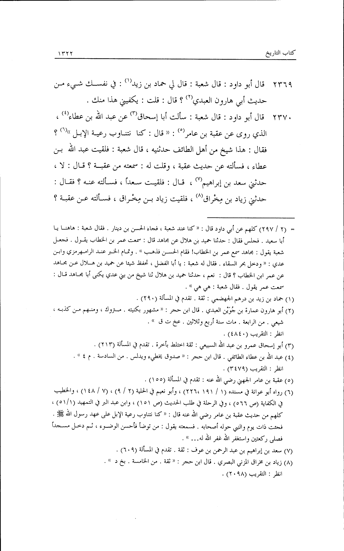 قال أبو داود: قال شعبة: رأيت زكريا بن أبي زائدة يأتي جابر فيسمع منه. قال سفيان: هذا الشيخ يجئ إلى هذا فيسمع منه ونحن أحداث. قال أبو داود: قال خارجة: حديث شعبة عن أبان لحديث. فقال شعبة: إذا أذكر أبان غثيت نفسي. قال: فذكرت قوله لا بان. قال: فترحم على شعبة ودعا له. قال أبو داود: وسمعت شعبة سأل الحسن بن دينار وجاء الحسن يعزيه على أخيه حماد، فقال له شعبة: يا أبا سعيد كيف حديث حميد بن هلا ل حديث عمر؟ فعرضه الحسن، فقال: نعم يا أبا بسطام حدثنا حميد بن هلا ل، عن مجاهد - وليس بأبي الحجاج - قال: صلى بن عمر صلا ة العصر، فقال: على مكانكم، إن أخوف ما أخاف عليكم.