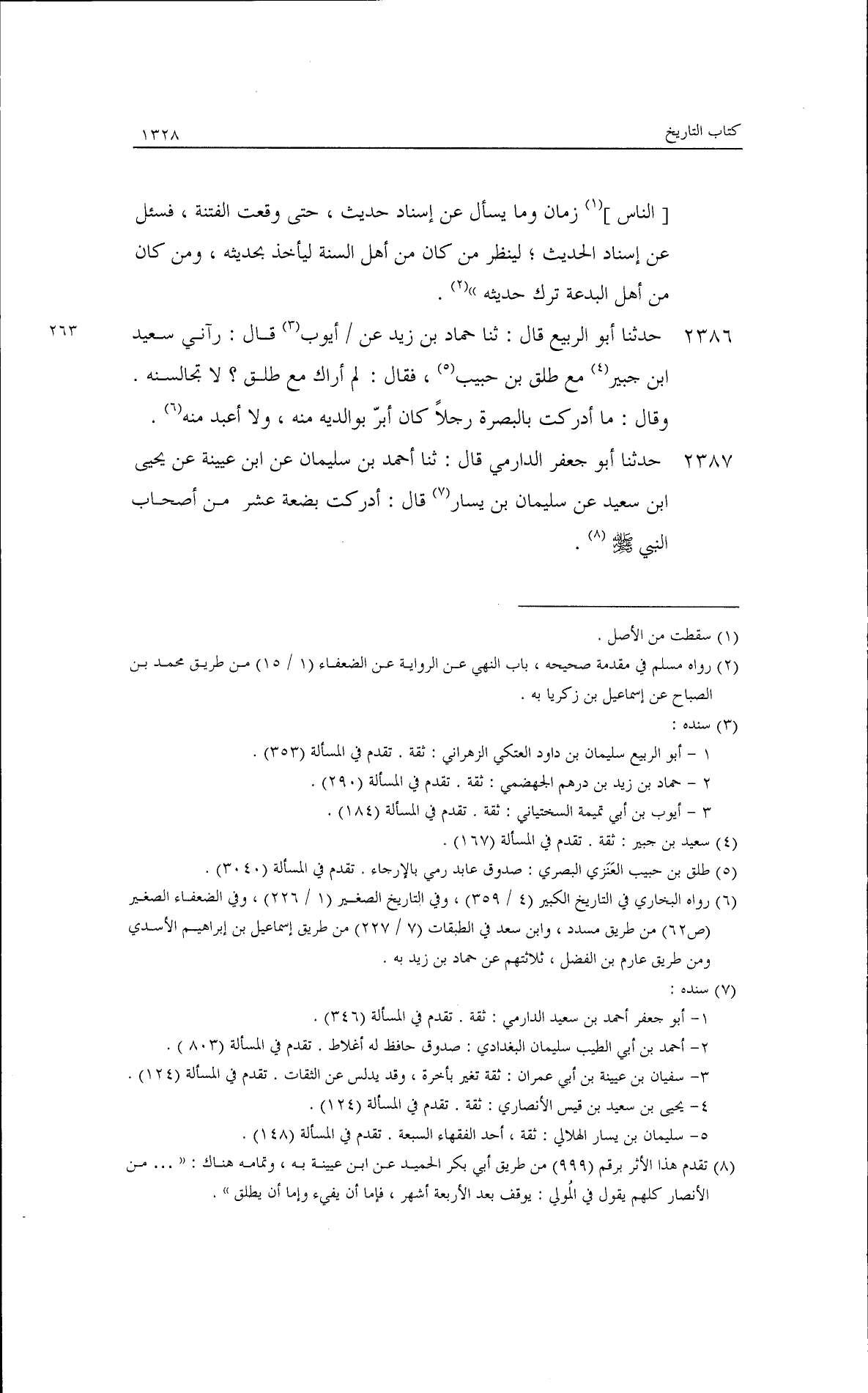 حدثنا أبو جعفر الدارمي قال: ثنا أحمد قال: ثنا هارون أبو العلاء قال: سمعت ربيعة بن أبي عبد الرحمن يقول: قال رسول الله - صلى الله عليه وسلم -: ((هلاك أمتي من ثلاث: من قبل القدرية، والعصبية، والرواية من غير ثقة)) قال: وربما سمعته يقول: ((والرواية من غير ثبت)). حدثنا أبو الربيع الزهراني قال: حدثنا إسماعيل - يعني: بين زكريا- عن عاصم الأحول، عن محمد بن سيرين قال: لقد أتى عليّ