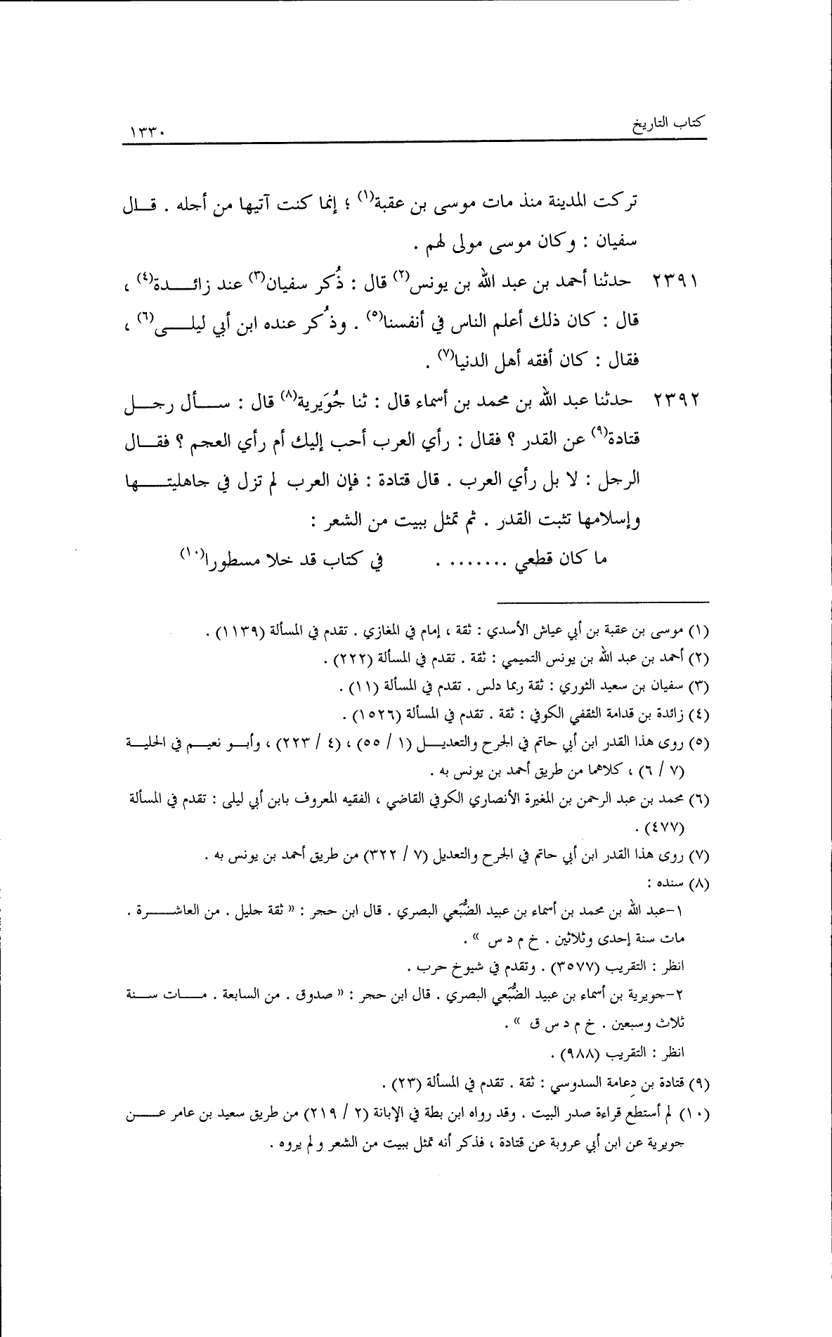 حدثنا أبو بكر الحميدي، قال: حدثنا سفيان قال: حدثنا يحيى بن سعيد قال: سئل ابن لعبد الله بن عمر عن مسألة فلم يقل فيها شيئًا، ولم يكن عنده فيها شيء. فقيل له: إنا لنعظم أن يكن مثلك ابن إمامي هدى يسئل عن أمر ليس عنده فيه علم. فقال: أعظم والله من ذاك عند الله وعند من عرف الله وعند من عقل عن الله أن أقول ما ليس لي به علم، أو أخبر عن غير ثقة. حدثنا أبو جعفر الدارمي قال: ثنا أحمد بن سليمان قال: ثنا ابن عيينة كنت أسأل أبا الزناد فأقول: يا أبا عبد الرحمن أي شيء بلغك في كذا وكذا؟ فيقول: الشأن فيه كذا وكذا. فأقول: هل سمعت ذلك من أحد؟ فيضحك، ويقول: هذا عندنا موطأ.