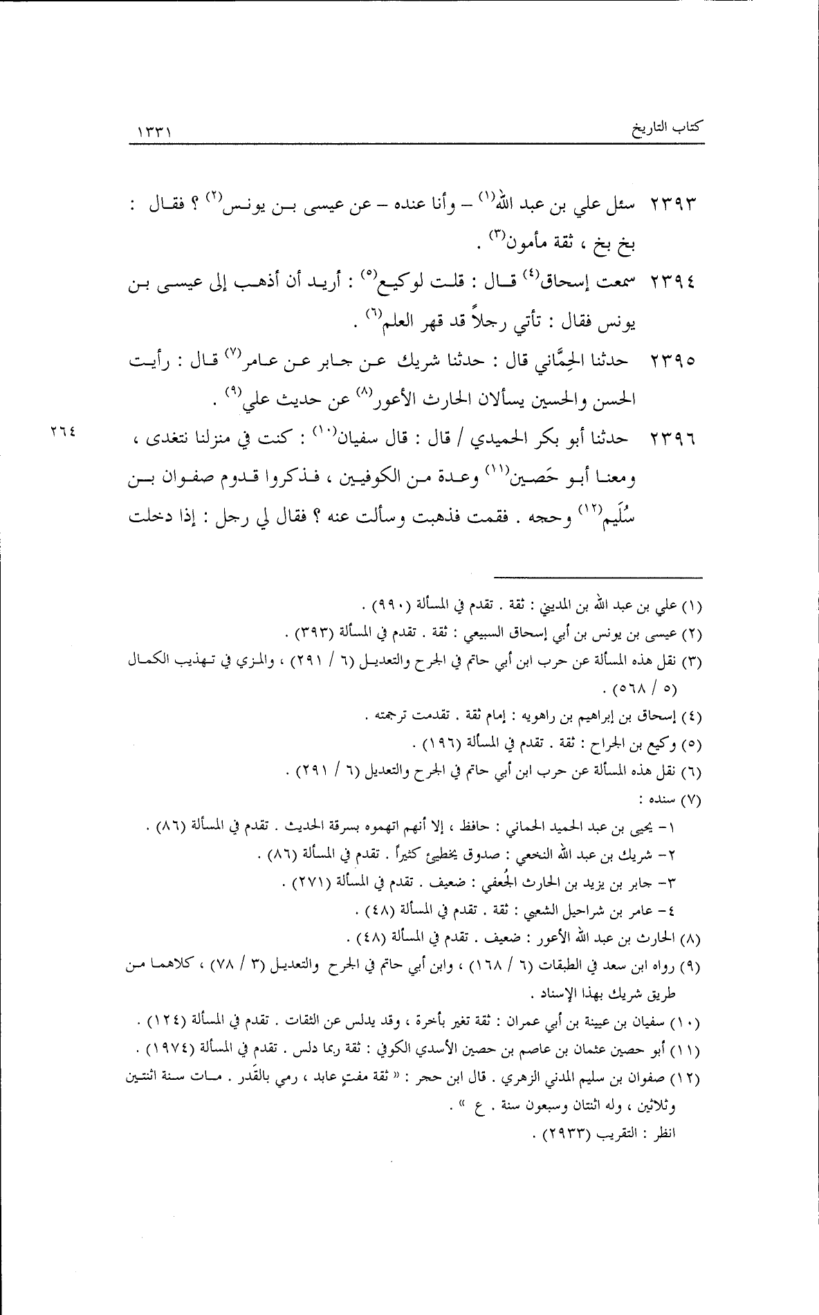 تركت المدينة منذ مات موسى بن عقبة، إنما كنت آتيها من أجله. قال سفيان: وكان موسى مولى لهم. حدثنا أحمد بن عبد الله بن يونس قال: ذكر سفيان عند زائدة قال: كان ذلك أعلم الناس في أنفسنا، وذكر عنده ابن أبي ليلى فقال: كان أفقه أهل الدنيا. حدثنا عبد الله بن محمد بن أسماء، قال: ثنا جويرية، قال: سأل رجل قتادة عن القدر؟ فقال: رأي العرب أحب إليك أم رأي العجم؟ فقال الرجل: لا بل رأي العرب. قال قتادة: فإن العرب لم تزل في جاهليتها وإسلامها تثبت القدر، ثم تمثل ببيت من الشعر: