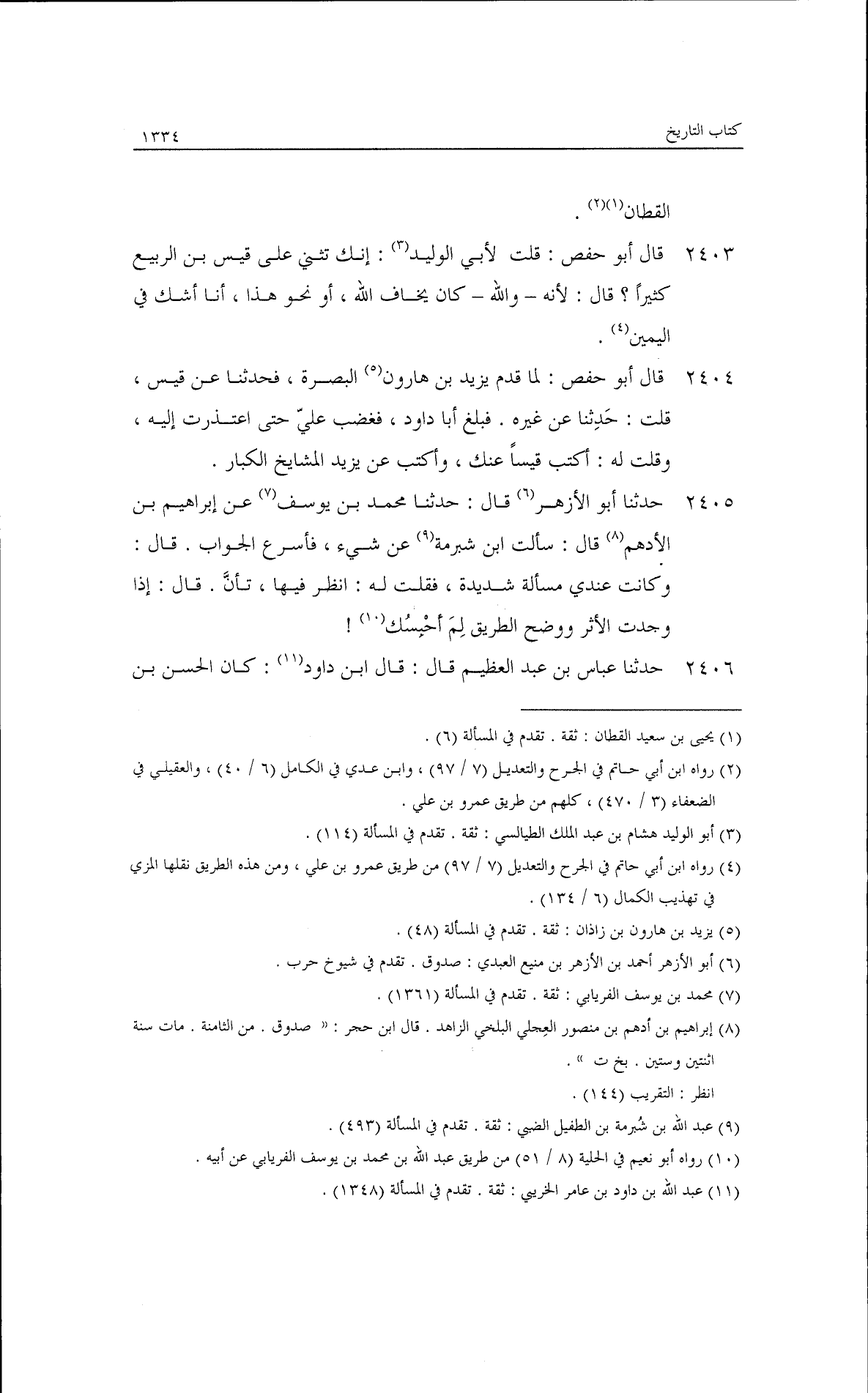 حدثنا الحميدي قال: سألتُ سفيان عن أحاديث الأعرج سمعها أبو الزناد من الأعرج، فقال سفيان: كان يقول لنا فيها أخبرني الأعرج أنه سمع أبا هريرة إلا حديث البقرة فإنه قال فيه أخبرني الأعرج أنه سمع أبا سلمة بن عبد الرحمن يقول: سمعت أبا هريرة يقول، ثم قال سفيان: كنت أسأل أبا الزناد عنها حديثًا حديثًا. قال سفيان: وكنت إذا سألتُ أبا الزناد عن من هذا؟ يقول هذا موطأ. فأقول: عمن هو؟ أي مشيختكم؟ قال: فيقول: أخبرني فلأن للحديث الذي أسأله عنه. قال الحميدي: وسمعت سفيان يقول: كان أبو الزناد أحسن شيء خُلقًا كنت أسأله عن الشيء فيقول: الشأن فيه كذا وكذا فأقول: يا أبا عبد الرحمن فأي علمائكم قال ذلك؟ فعجب مني، ويقول: انظروا انظروا ثم يجيبني. سمعت أحمد يقول: كان يحيى بن حماد رجلا صالحًا. سمعت أبا حفص قال: سمعت أبا داود يقول: /260/سمعت شعبة يقول: يا عجبًا لهذا الأحول لا يرضى قيس بن الربيع. يعني يحيى بن سعيد