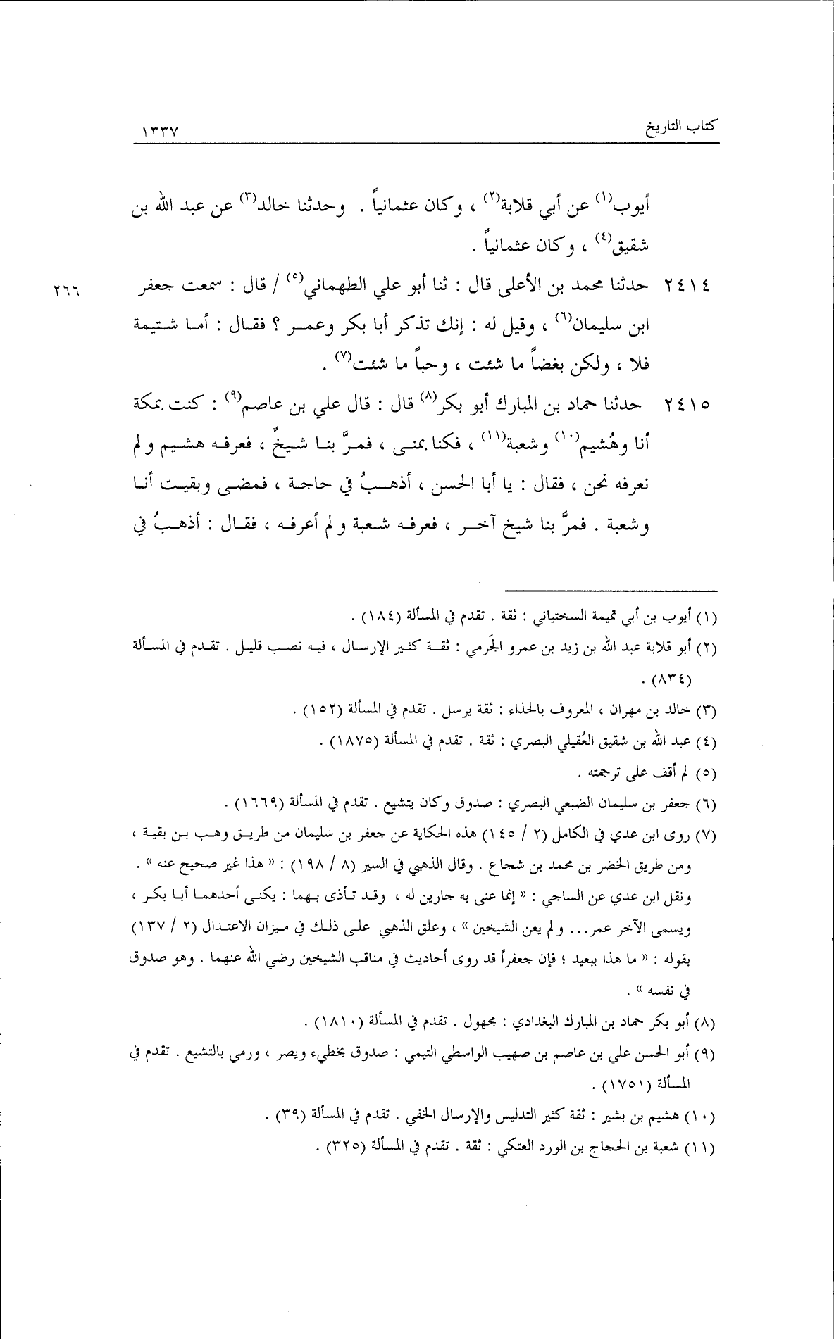 وسفيان يحدثنا عنه بأحاديث لم نسمعها. حدثنا إبراهيم بن مستمر قال: سمعت أبا الوليد يقول قبل أن يقدم عمرو بن حكام: يقدم عليكم رجل من أروى أهل البصرة. عن شعبة قال إبراهيم: سألتُ علي بن عبد الله عن عمرو بن حكام؟ فقال: هو ثقة، ثم سألتُه بعد ذلك عنه بسنتين فقال: ما أنقم عليه شيئًا إلا حديث الزنجبيل. حدثنا محمد بن عبد الأعلى قال: سمعت يزيد بن زريع قال: حدثني