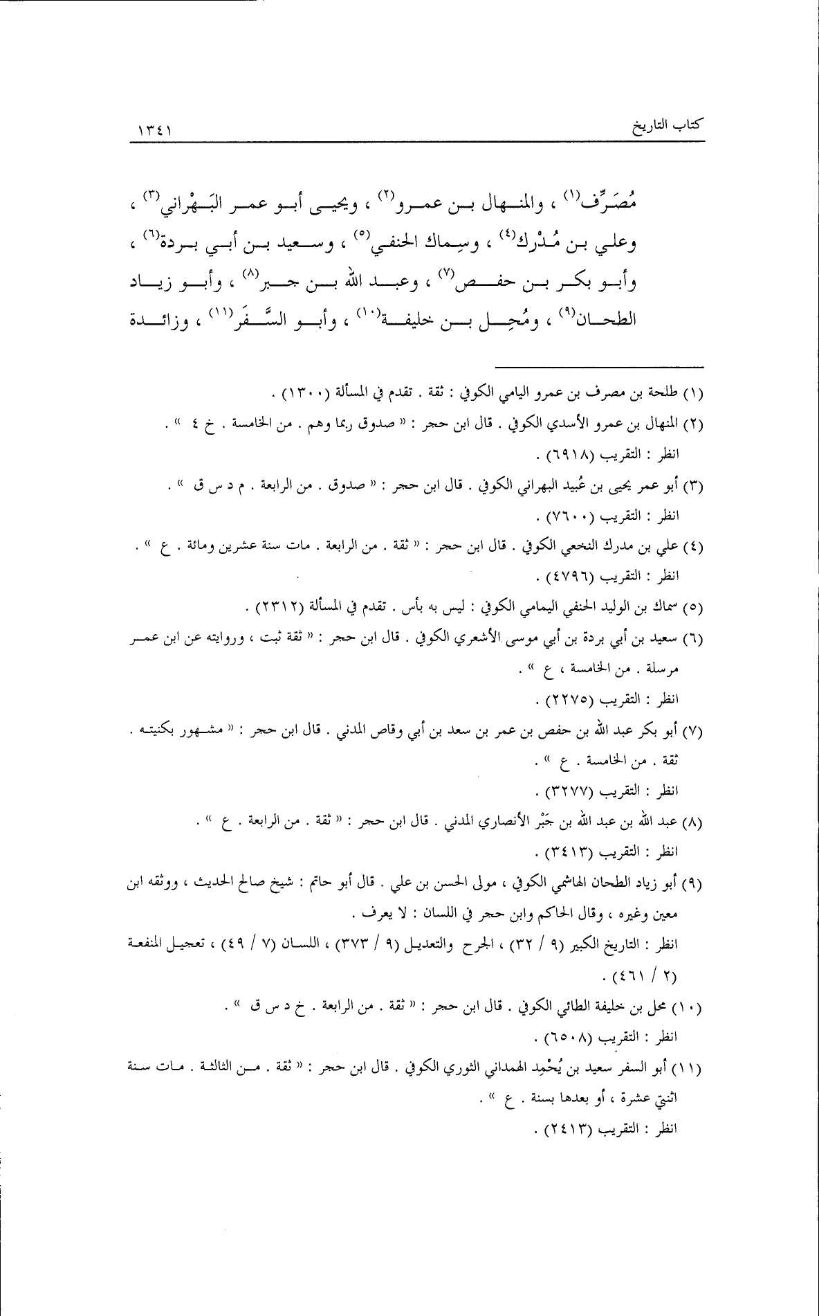 قالا: نهى رسول الله - صلى الله عليه وسلم - /262/أن يؤكل اللحم حتى يمضي عليه ثالثة أو تمسه النار وكان وكيع قد رواه عن مسرة، عن سليمان بن موسى وكان المشهور بالشام ما حدثنا الوليد بن النضر قال: حدثنا مسرة بن معبد، عن الزهري، ثم أخرجه سوار فجمعهما جميعًا عن الزهري وسليمان بن موسى. فقال أبو سعيد - يعني عبد الرحمن بن إبراهيم -: قلت: وكيع. قال علي بن عبد الله: أملى عليّ يحيى بن سعيد هؤلاء المشيخة، فقال: هؤلاء مشيخة شعبة من أهل الكوفة الذين لم يلقهم سفيان بن سعيد، منهم إسماعيل بن رجاء، وعبيد بن حسن، والحكم بن عتيبة، وعبد الملك بن ميسرة، وعدي بن ثابت، وطلحة بن