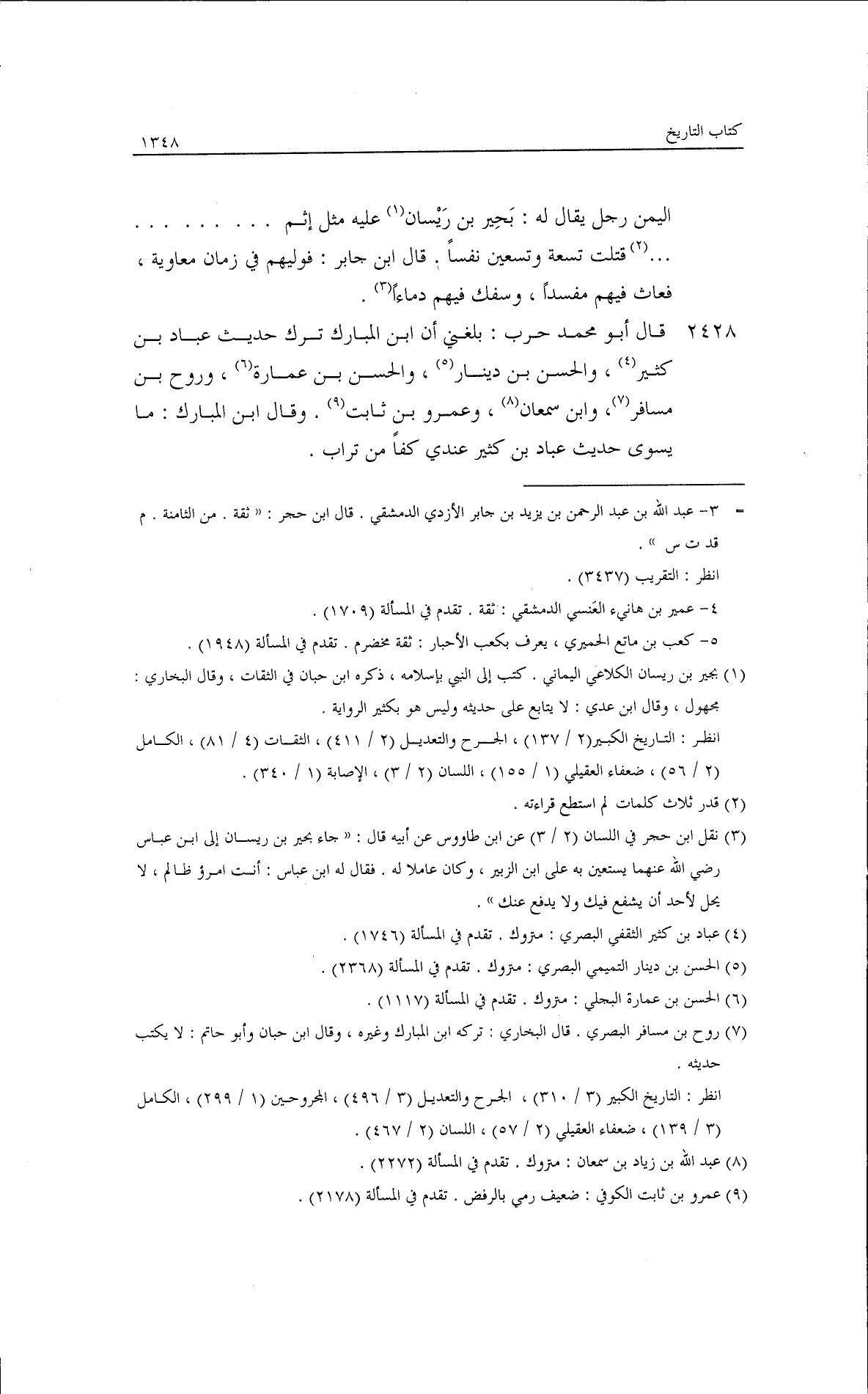 قيس الأزدي فاحتبس عنده هنهه، ثم خرج إلينا فقال: إنه كذاب. قال أبو مسهر: وقتله أبو جعفر في الزندقة. حدثنا عبدة بن عبد الرحمن قال: حدثنا بقية بن الوليد قال: حدثنا عتبة بن أبي حكيم قال: جلس إسحاق بن عبد الله بن أبي فروة في مسجد المدينة يحدث والزهري إلى جانبه. فيقول: قال رسول الله فلما أكثر قال الزهري: قاتلك الله يابن أبي فروة ما أجرأك على الله ألا تسند حديثك تحدثنا بأحاديث ليست لها خطم ولا أزمة. حدثنا محمود بن خالد الدمشقي قال: حدثنا الوليد بن مسلم قال: حدثنا ابن جابر قال: حدثني عمير بن هانئ، عن كعب الأحبار فقال: يلي