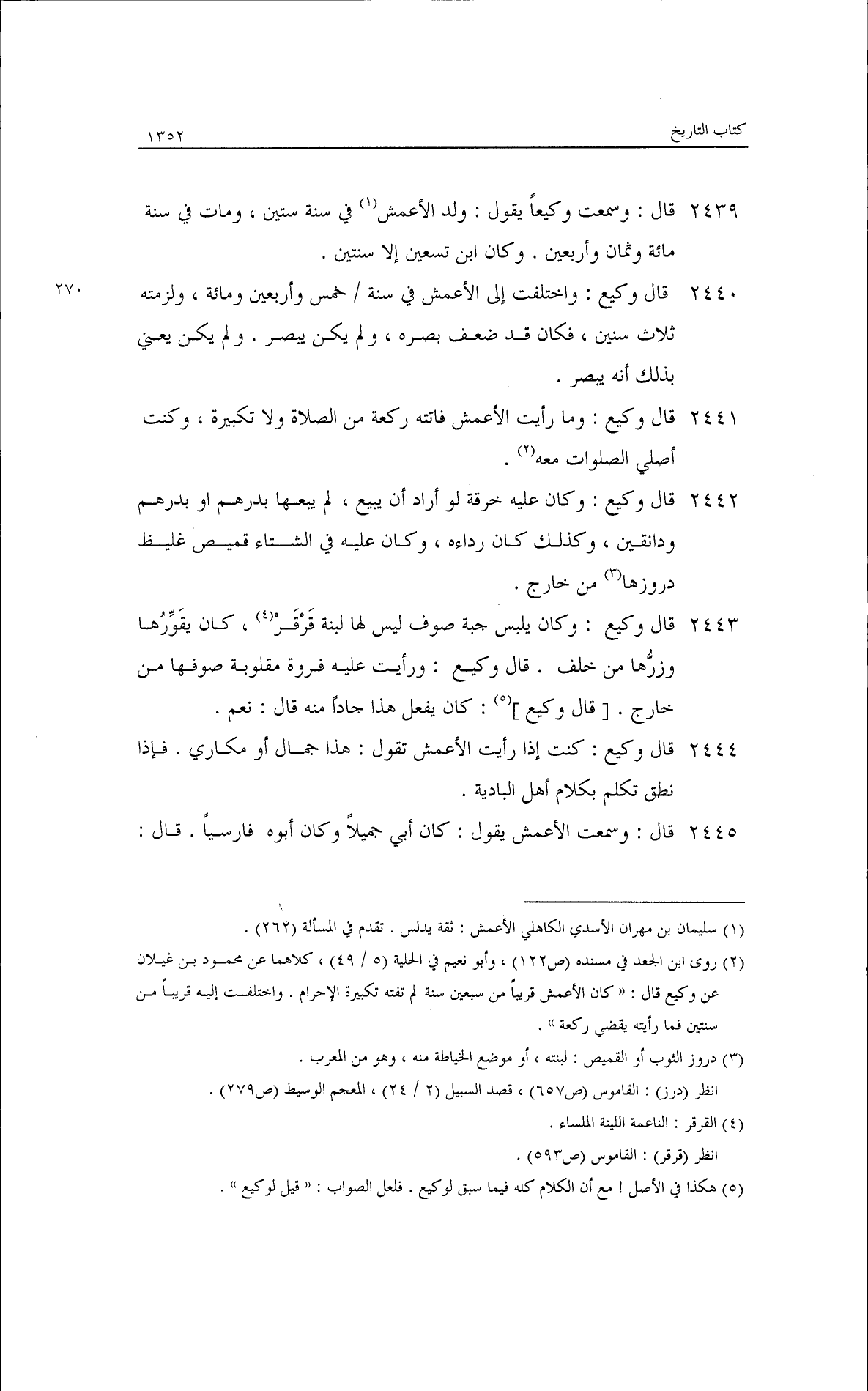 يقول: لما مات سفيان خرقوا كتبه ما كان في القراطيس وما كان في الطروس محوه فباعوه والباقي دفنوه. قال: وسمعت وكيعًا يقول: قال سفيان مرة: إن كان الرجل ليجالس الرجل مرة فيعرفه. أو كما قال. قال: فظننا أنه يعني نفسه. قال: وسمعت وكيعًا يقول: استعمل ابن هبيرة على الكوفة فدعا منصور بن المعتمر، فأراد أن يستقضيه، فأبى، فقال: إن فعلت وإلا صنعت بك وصنعت. فأقهره، فكانوا يجيئون إلى المسجد فيقعد، فإذا جاءوا إليه قالوا: أقض بيننا. سكت فلم يكلمهم حتى كان أيام، فقالوا لابن هبيرة: إن منصورًا ليس يقض بيننا. فهم به، فقالوا له: إن منصورًا ليس ممن يضرب، فلما أيس منه استعمل مكانه أخي. قال وكيع: وكان منصور يقوم الليل وكانت له أم أعجمية، قال: وكان هو مثل ظن، أو خشية الليل أجمع ويبكي فتقول له أمه: يا بني قتلت قتيلا، أشركت في دم، ما حالك؟