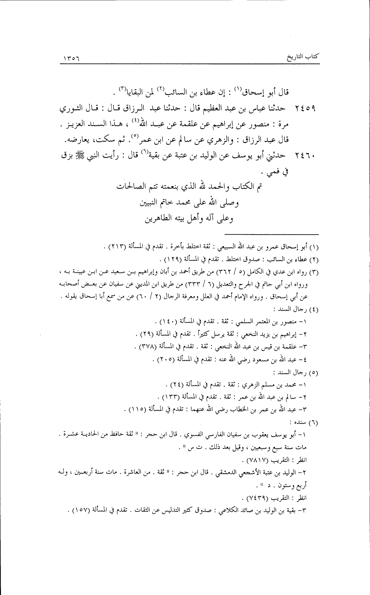 حدثنا عباس قال: حدثنا أبو نعيم، عن سفيان قال: قال حبيب بن أبي ثابت: ما أردت بشيء مما ترون وجه الله. حدثنا عباس قال: ثنا أبو نعيم قال: ثنا سفيان عن سلمة قال: ما رأيت أحدًا يريد بعلمه وجه الله والدار الآخرة إلا عطاء وطاوس ومجاهد. حدثنا عباس قال: حدثنا عبد الرزاق قال معمر: من أخذ العلم جملة ذهب منه جملة.