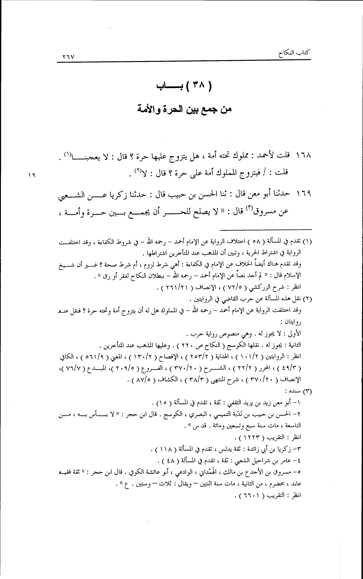 حدثنا أبو معن، قال: ثنا الحسن بن حبيب قال: حدثنا زكريا عن الشعبى، عن مسروق قال: لا يصلح للحر أن يجمع بين حرة وأمة،