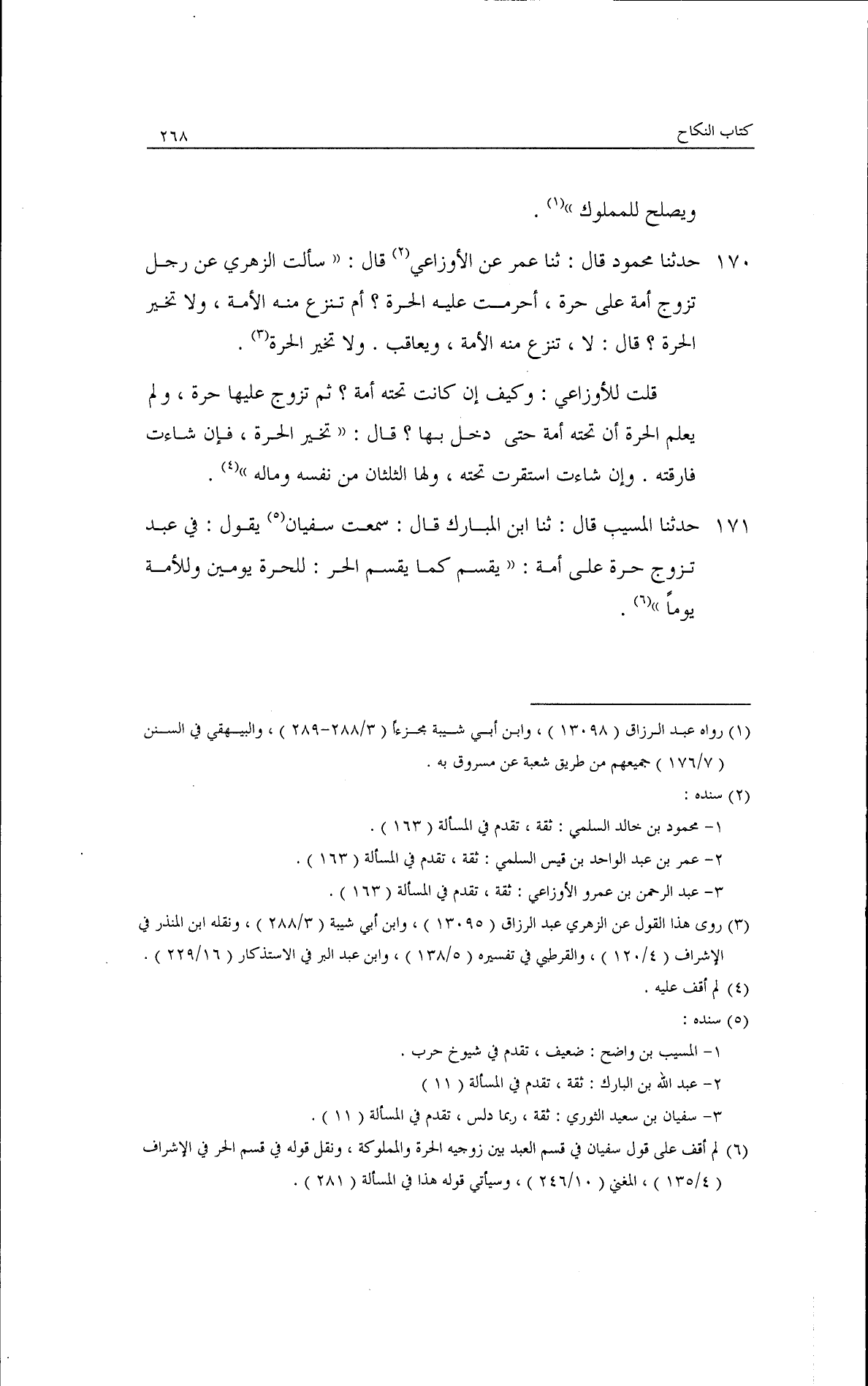 حدثنا المسيب: قال: ثنا ابن مبارك, قال: سمعت سفيان يقول قي عبد يتزوج حرة على أمة.