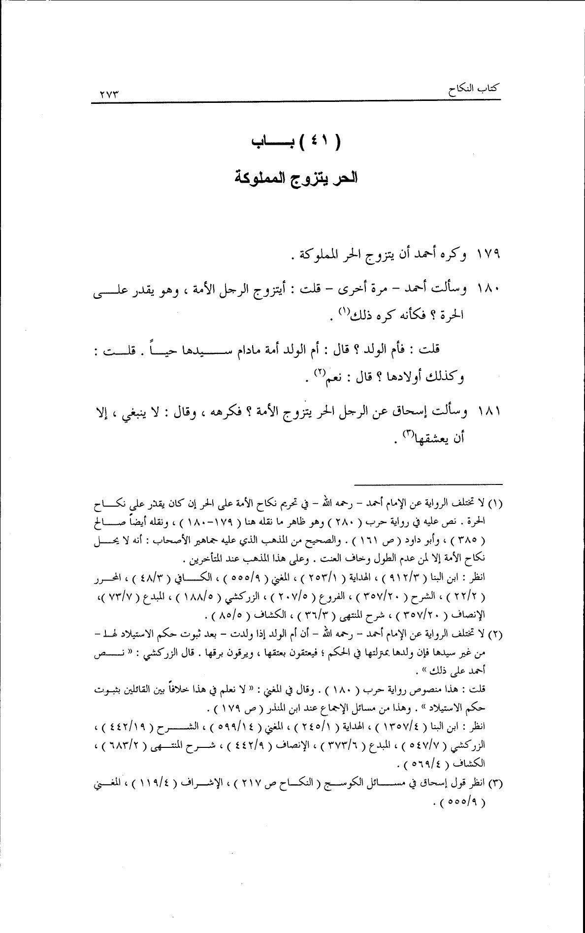 وكره أحمد أن يتزوج الحر المملوكة، وسألت أحمدَ مرة أخرى: قلتُ: أيتزوج الرجل الأمة، وهو يقدر على الحرة؟ فكأنه كره ذلك.