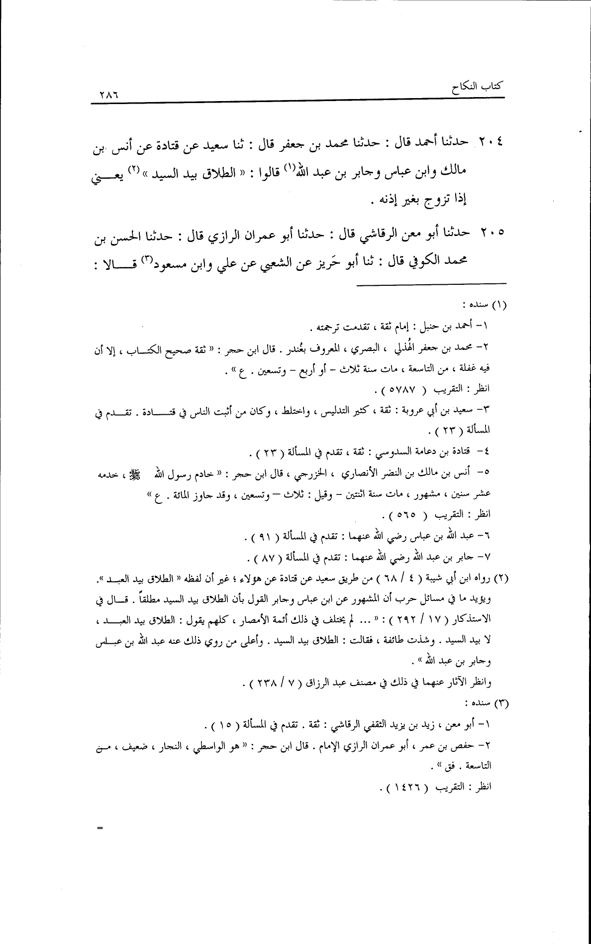 حدثنا أحمد: قال: حدثنا محمد بن جعفر: قال: ثنا سعيد: عن قتادة، عن أنس بن مالك وابن عباس وجابر بن عبد الله قالوا: الطلاق بيد السيد، يعنى إذا تزوج بغير إذنه.