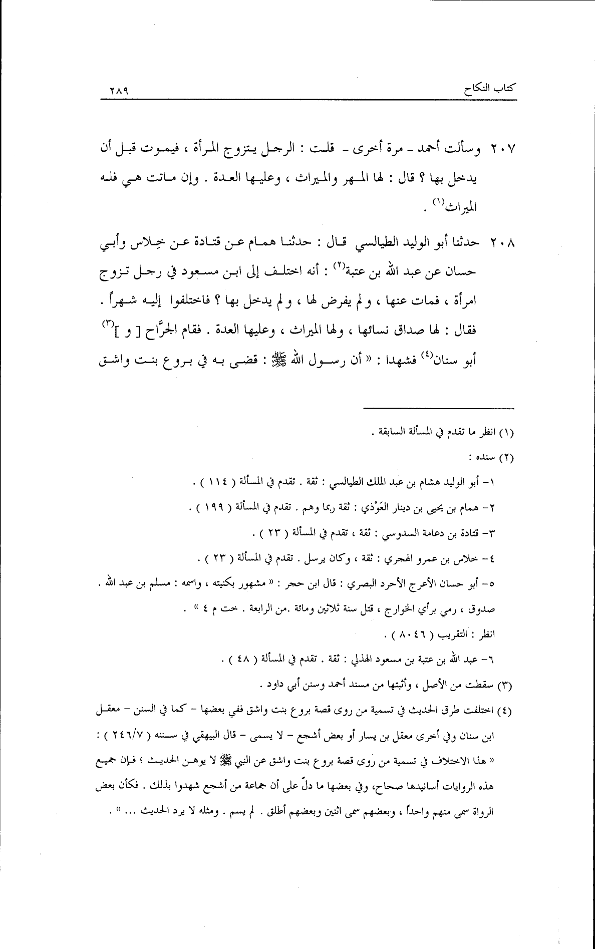 حدثنا أبو الوليد الطيالسى، قال: حدثنا همام، عن قتادة، عن جلاس وأبي حسان، عن عبد الله بن عتبة: أنه اختلف إلى ابن مسعود في رجل تزوج امرأة، فمات عنها، ولم يفرض لها، ولم يدخل بها، فاختلفوا إليه شهرًا، فقال: لها صدق نسائها، ولها الميراث، وعليها العدة، فقام الحراح أبو سنان، فشهد: أن رسول الله - صلى الله عليه وسلم - قضى به في بروع بنت واشق