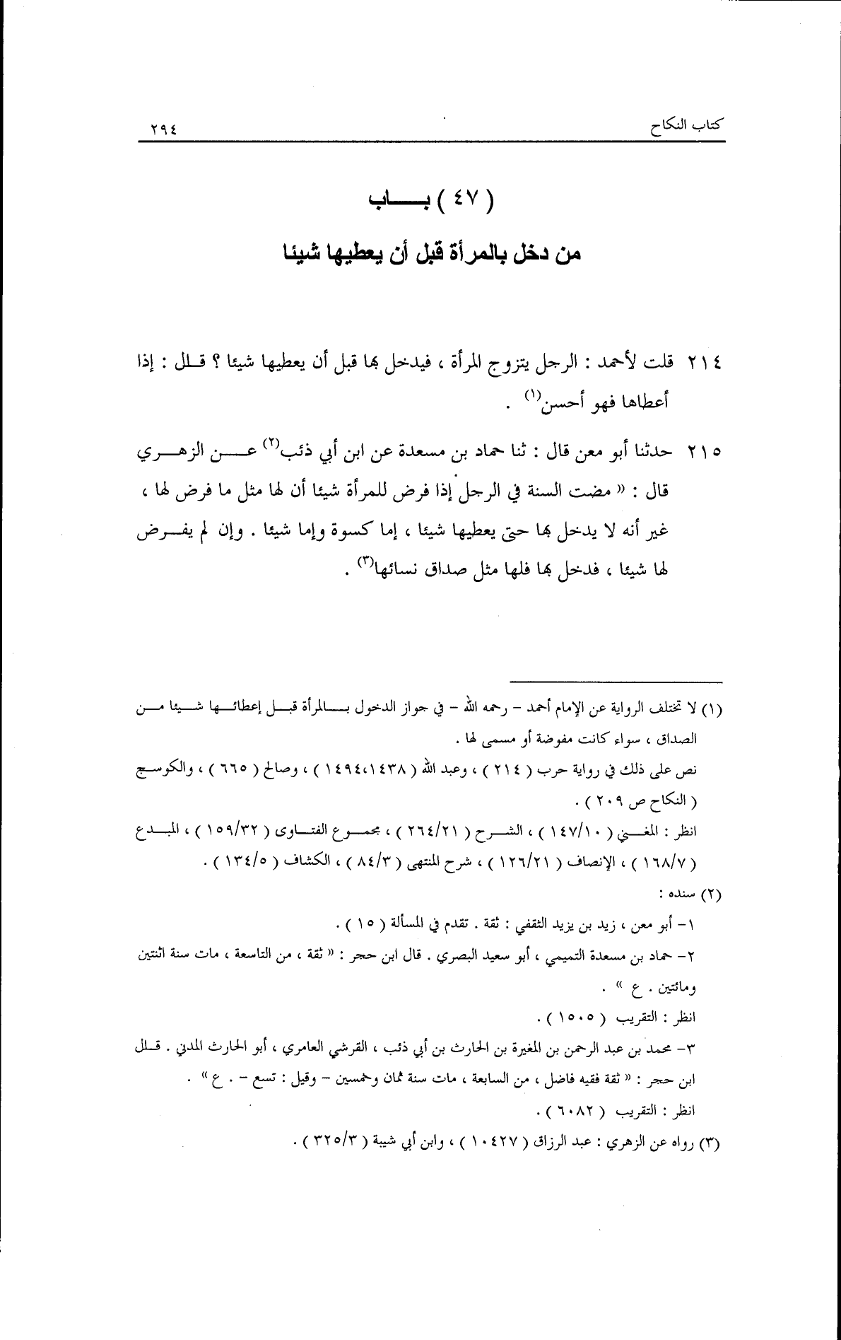 قلتُ لأحمدَ: الرجل يتزوجُ المرأةَ، فَيدخل بها قبل أَنْ يعطيَها شيئًا؟