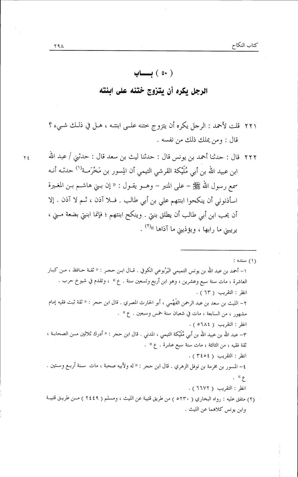 قال: حدثنا أحمد بن يونس، قال: حدثنا الليث بن سعد، قال: /24/حدثني عبد الله بن عبيد الله بن أبي مليكة القرشي التيمي أن المسور بن مخرمة حدثه: أنه سمع رسول الله - صلى الله عليه وسلم - على المنبر وهو يقول: ((أن بنى هاشم بن المغيرة استأذنوني أن ينكحوا ابنتهم علي بن أبي طالب، فلا آذن، ثم لا إذن، ثم لا إذن، إلا أن يحب بن أبي طالب أن يطلق بنتي وينكح ابنتهم، فإنما ابنتي بضعة مني بريبني ما رابها، ويؤذينى ما آذاها)).