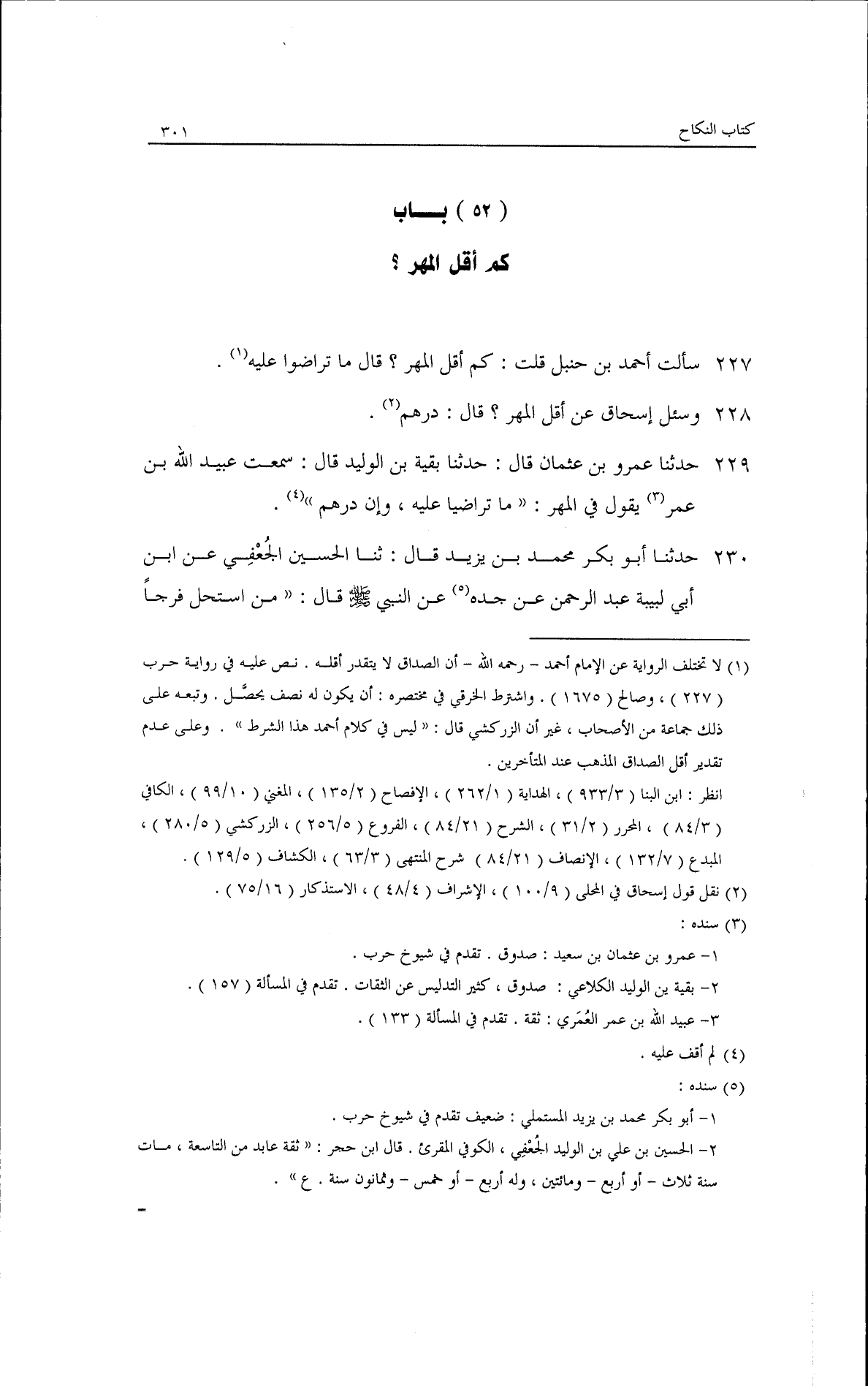 سألت أحمدَ بن حنبل: قلتُ: كم أقل المهر؟