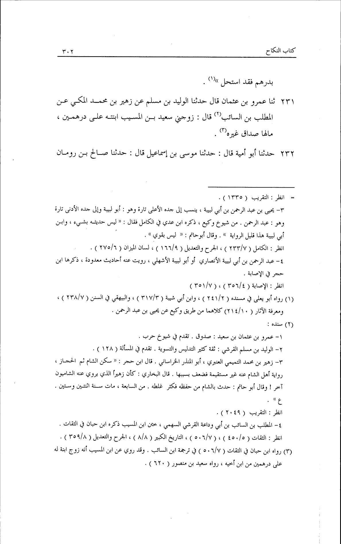 ثنا عمرو بن عثمان، قال: حدثنا الوليد بن مسلم، عن زهير بن محمد المكى، عن المطلب بن السائب، قال: زوجني سعيد بن المسيب ابنته على درهمين ما لها صداق غيره.