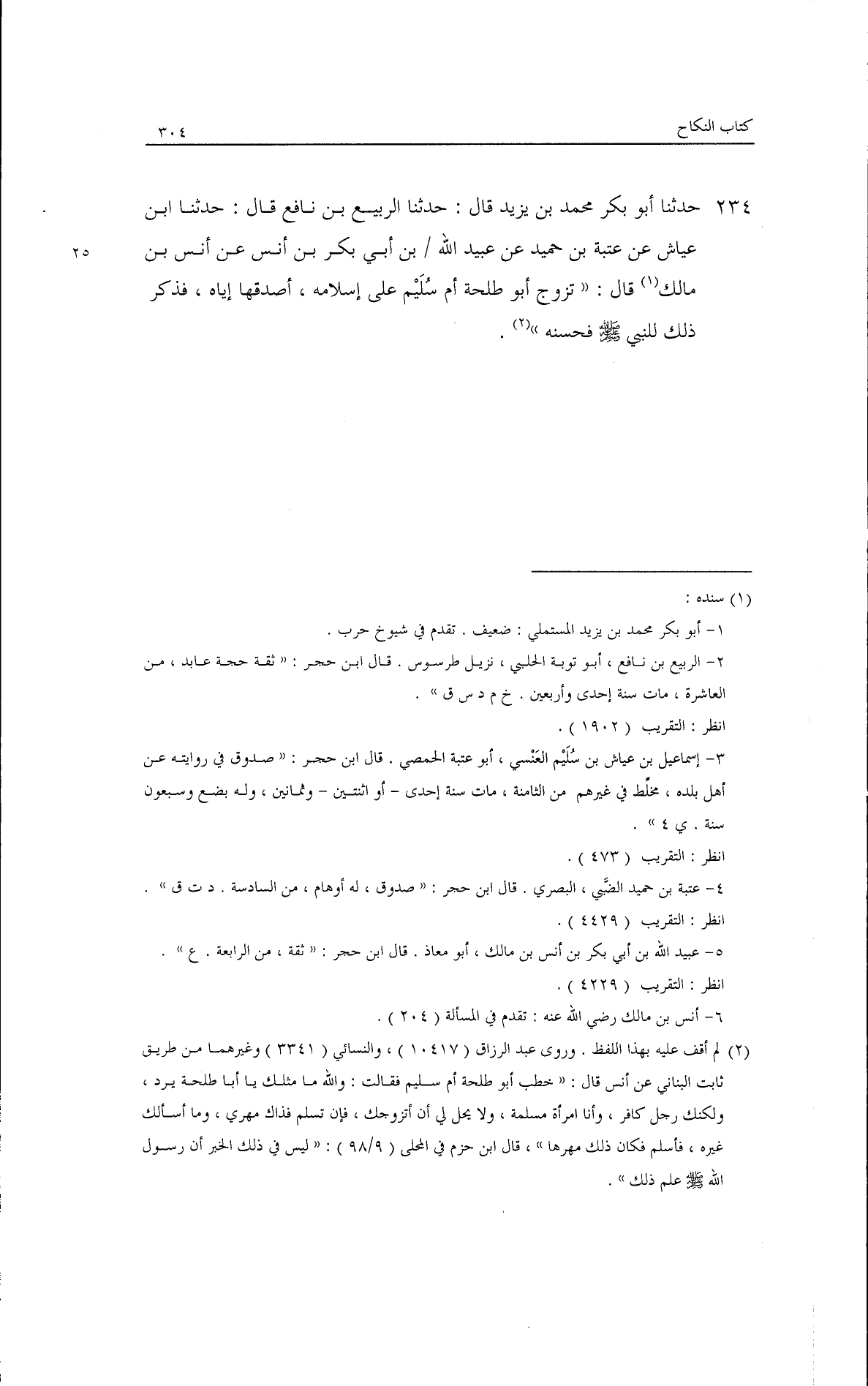 حدثنا أبو بكر محمد بن يزيد، قال: حدثنا الربيع بن نافع، قال: حدثنا ابن عباس، عن عتبة بن حميد، عن عبيد الله /25/ بن بكر بن أنس، عن أنس بن مالك، قال: تزوج أبو طلحة أم سليم على إسلامه، أصدقها إياه، فذكر ذلك للنبي - صلى الله عليه وسلم - , فحسَّنه.