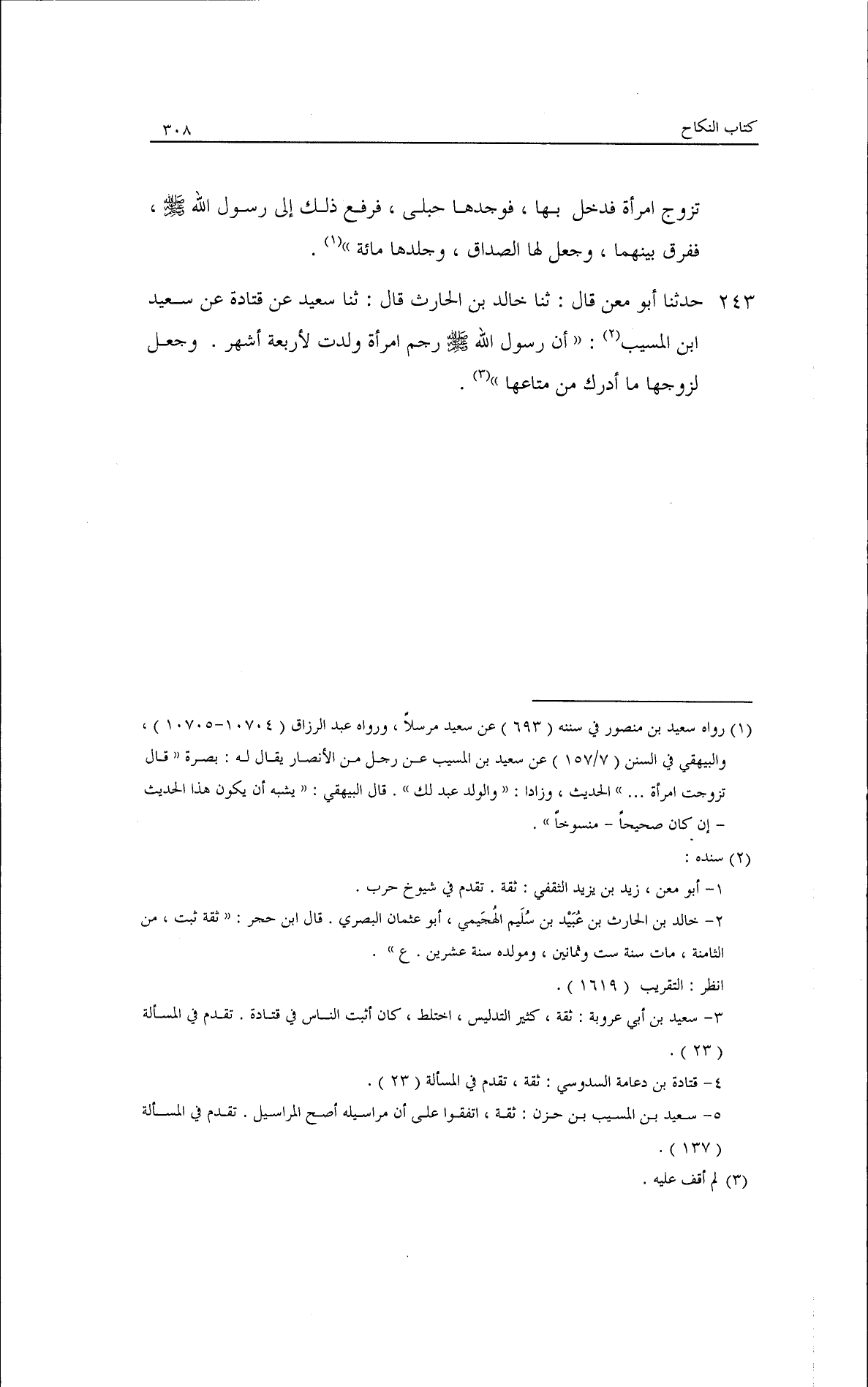 حدثنا أبو معن، قال: ثنا خلد بن الحرث، قال: ثنا سعيد، عن قتادة، عن سعيد بن المسيب: أن رسول الله - صلى الله عليه وسلم - رجم امرأة ولدت لأربعة أشهر، وجعل لزوجها ما أدرك من متاعها.