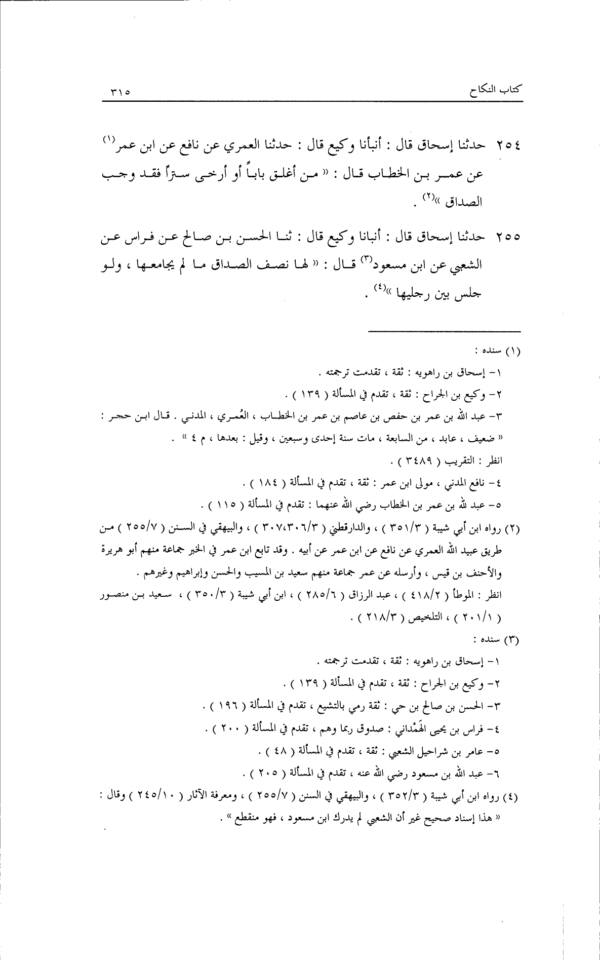 حدثنا إسحاق، قال أبنا وكيع، قال: حدثنا العمري، عن نافع، عن ابن عمر، عن عمر بن الخطاب، قال: من أغلق بابًا، أو أرخى سترًا، فقد وجب الصداق.