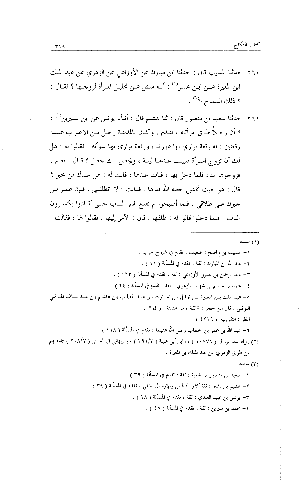 حدثنا المسيب، قال: حدثنا ابن مبارك، عن الأوزاعي، عن الزُّهْرِيّ، عن عبد الملك بن المغيرة، عن ابن عمر أنه سُئلَ عن تحليل المرأة لزوجها، فقال: ذلك السفاح.