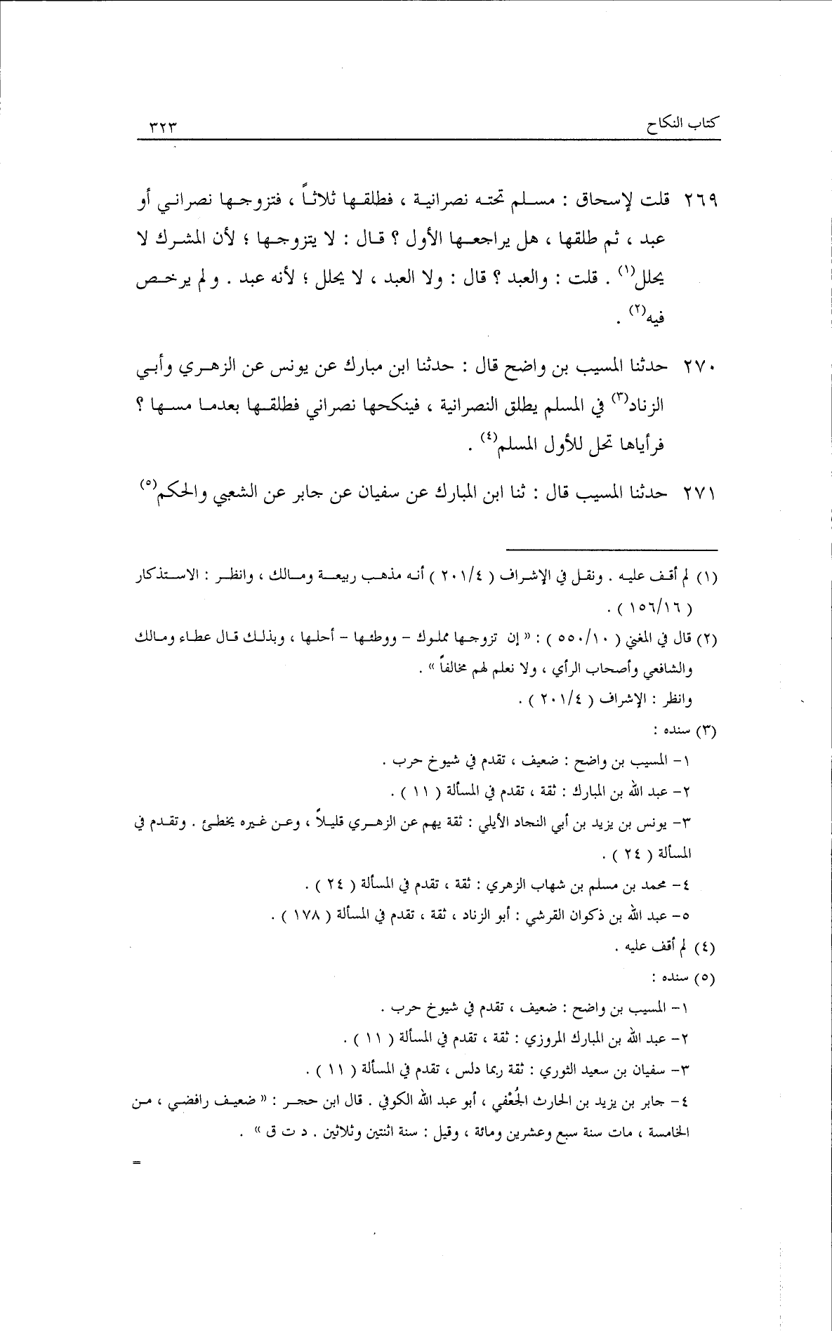 حدثنا المسيب بن واضح، قال حدثنا ابن مبارك، عن يونس، عن الزُّهْرِيّ وأبي الزناد في المسلم يطلق النصرانية، فينكحها نصراني، فطلقها بعد ما مسها، فرأياها تحل للأول المسلم.