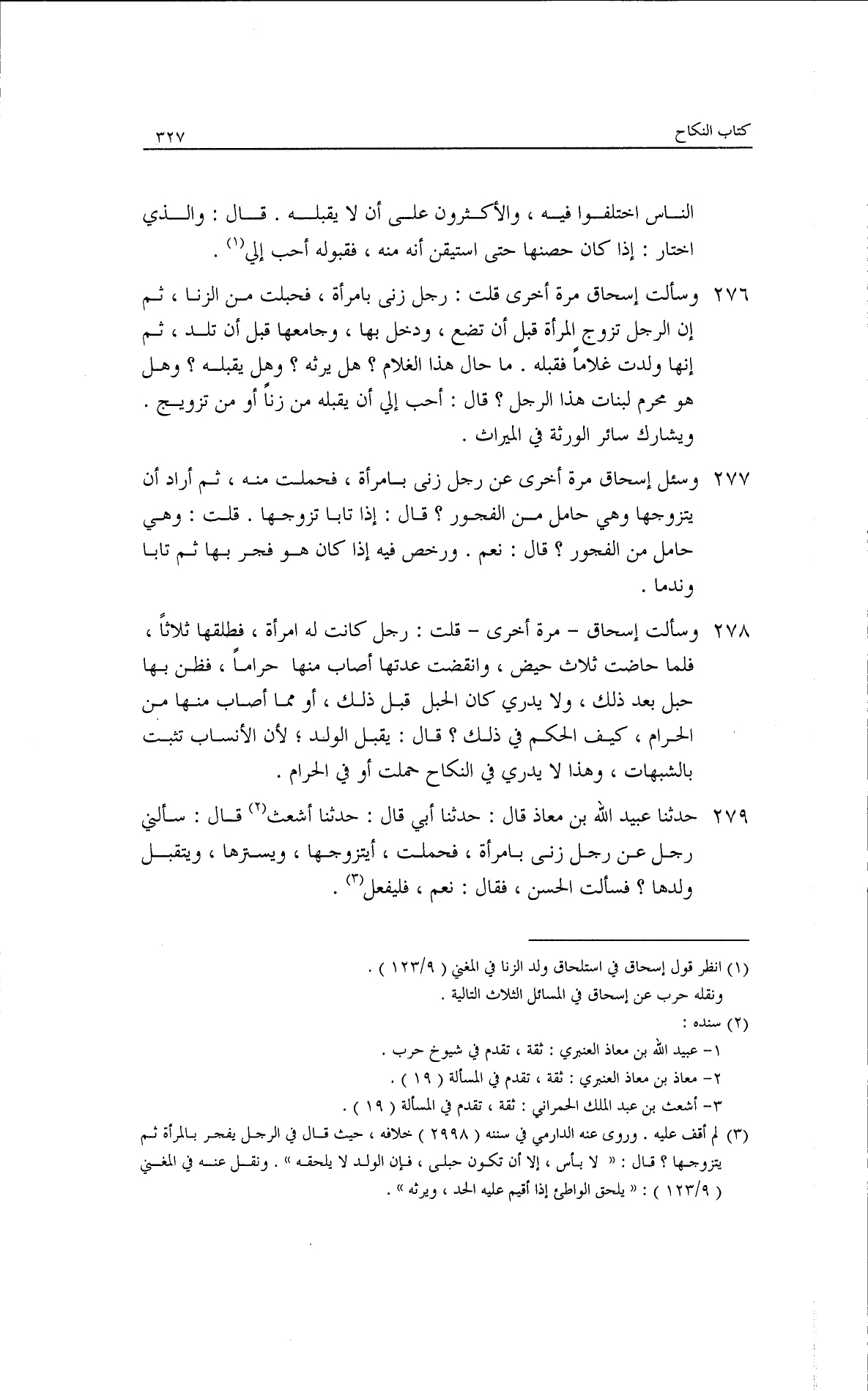 وسألتُ إسْحاقَ مرةً أخرى، قلتُ: رجل زنا بامرأةٍ فحبلت من الزنا، ثم إن الرجل تزوج المرأة قبل أن تضع، ودخل بها وجامعها قبل أن تلد، ثم أنها ولدت غلامًا فقبله، ما حال هذا الغلام، هل يرثه؟ وهل يقبله؟ وهل هو محرم لبنات هذا الرجل؟