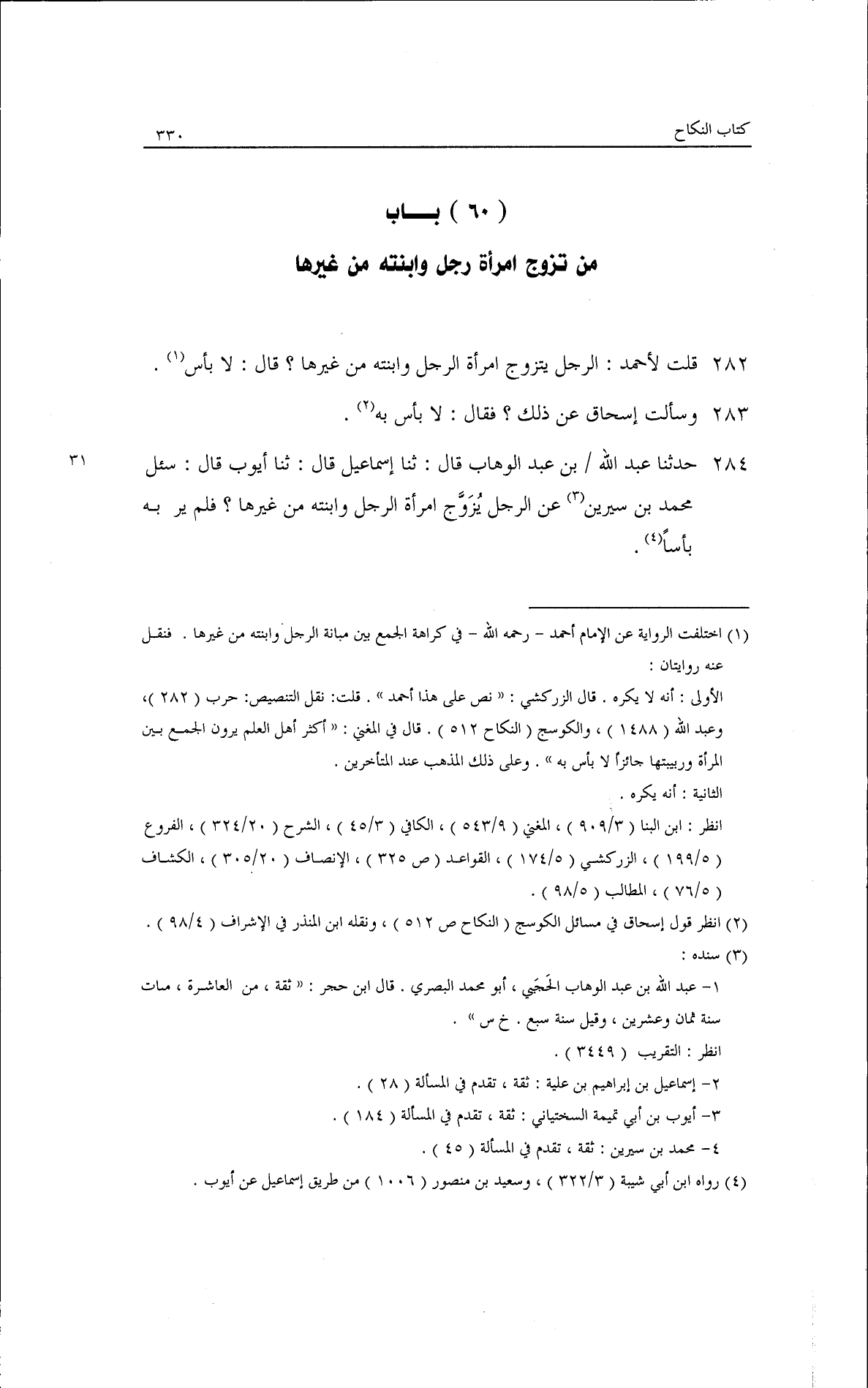 حدثنا عبد الله/31/ بن عبد الوهاب قال: ثنا إسماعيل، قال: ثنا أيوب، قال: سئل محمد بن سيرين عن الرجل يزوج امرأة الرجل وابنته من غيرها، فلم ير به بأسًا،
