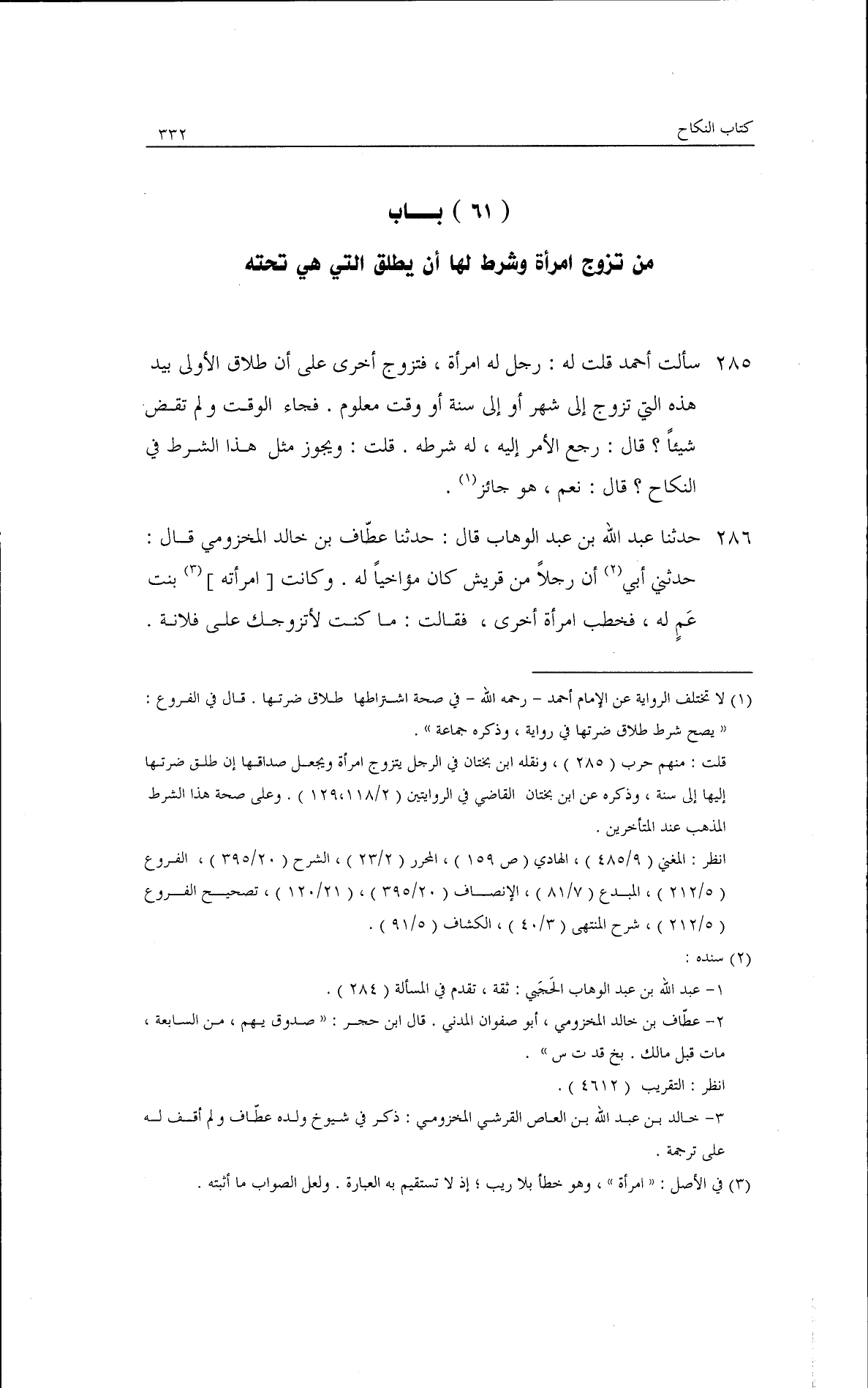 حدثنا عبد الله بن عبد الوهاب، قال: حدثنا عطاف بن خلد المحرومى، قال: حدثنى أبي: أن رجلاً من قريش كان مؤاخيًا له، وكانت امرأته بنت عم له، فخطب امرأة أخرى، فقالت: ما كنت لأتزوجك على فلانة،