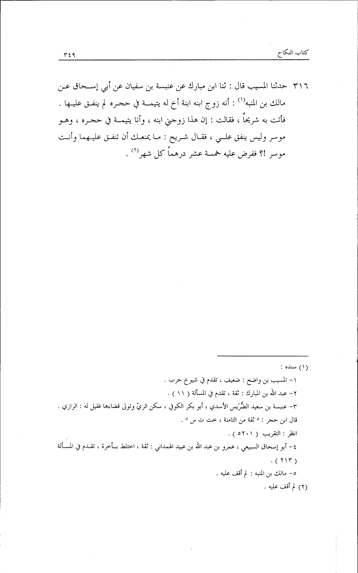 حدثنا المسيب، قال: ثنا ابن مبارك، عن عنبسة بن سفيان، عن أبي إسحاق، عن مالك بن المنبه أنه زوَّج ابنه ابنت أخ له يتيمة في حجره لم ينفق عليها، فأتت به شريحًا، فقالت: إن هذا زوجني ابنه، وأنا يتيمة في حجره، وهو موسر وليس ينفق علي.