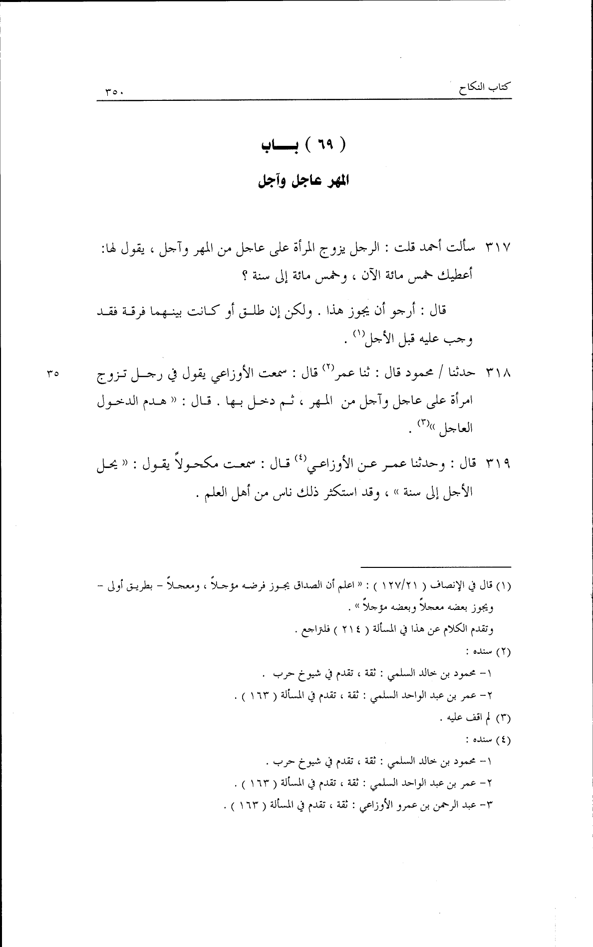 حدثنا /35/محمود، قال أبنا عمر، قال: سمعت الأوزاعى يقول في رجل تزوج امرأة على عاجل وآجل من المهر، ثم دخل بها؟