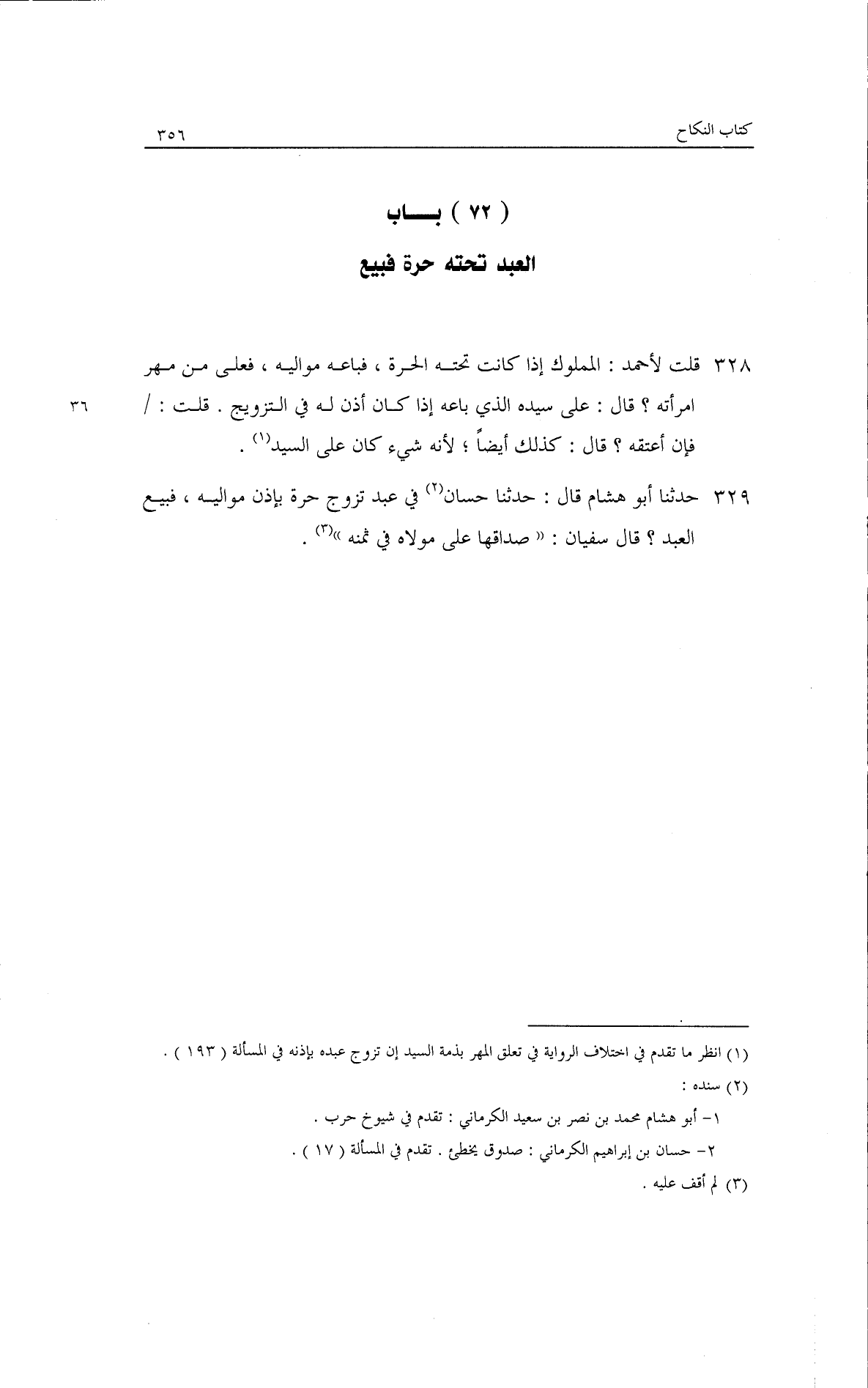 حدثنا أبو هشام، قال: حدثنا حسان في عبد تزوج حرة بإذن مواليه، فبيع العبد، قال سفيان: صداقها على مولاه في ثمنه.