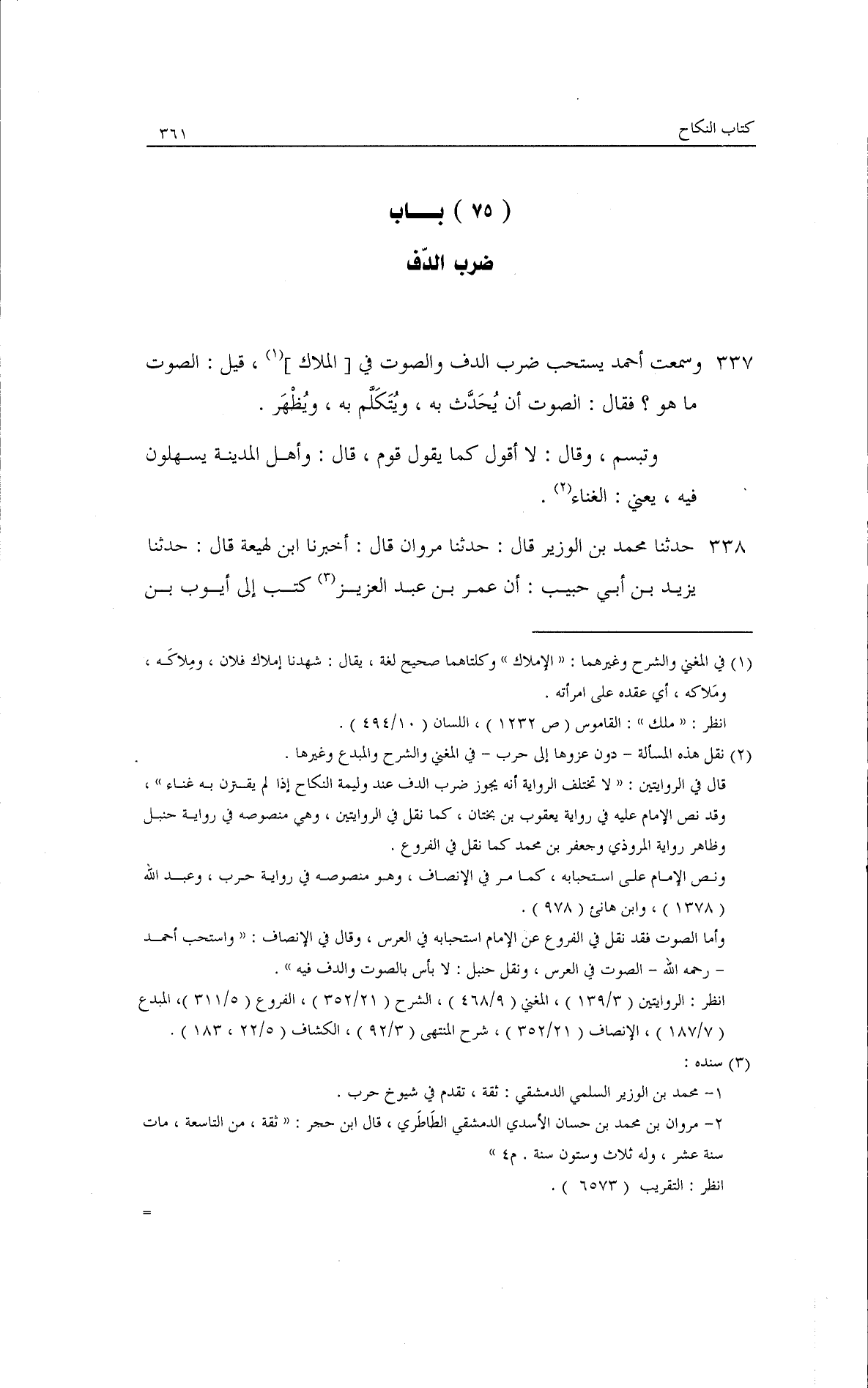 وسمعت أحمد يستحب ضرب الدف والصوت في الملاك.